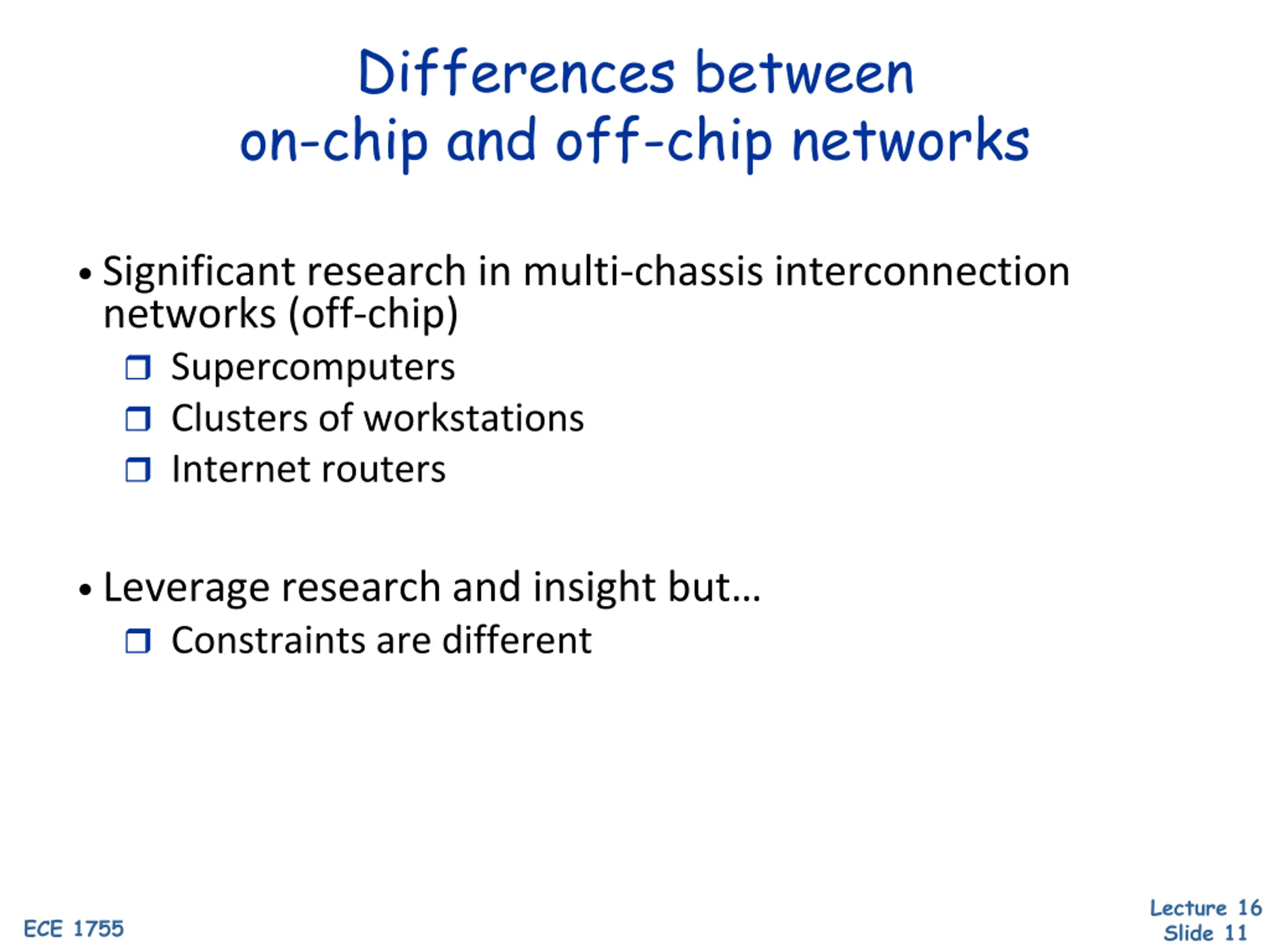 Differences between on-chip and off-chip networks Significant research in multi-chassis interconnection networks (off-chip) Supercomputers Clusters of workstations Internet routers Leverage research and insight but Constraints are different Lecture 16 Slide 11 ECE 1755