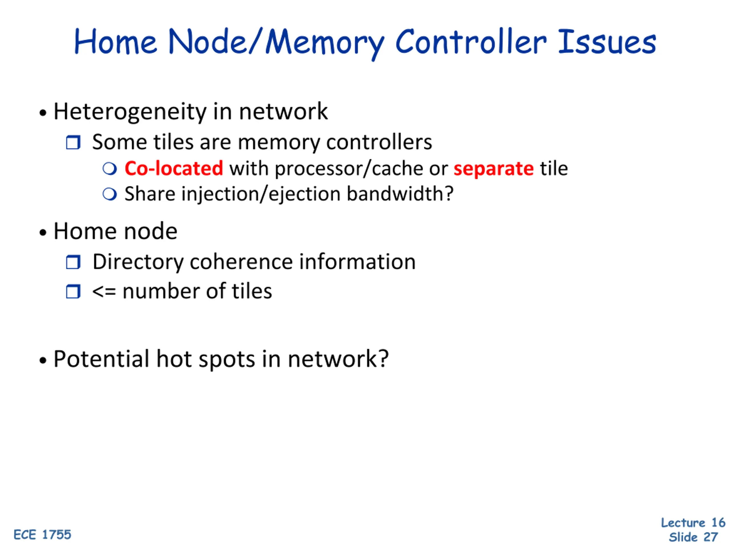 Home Node/Memory Controller Issues Heterogeneity in network Some tiles are memory controllers Co-located with processor/cache or separate tile Share injection/ejection bandwidth? Home node Directory coherence information <= number of tiles Potential hot spots in network? Lecture 16 Slide 27 ECE 1755