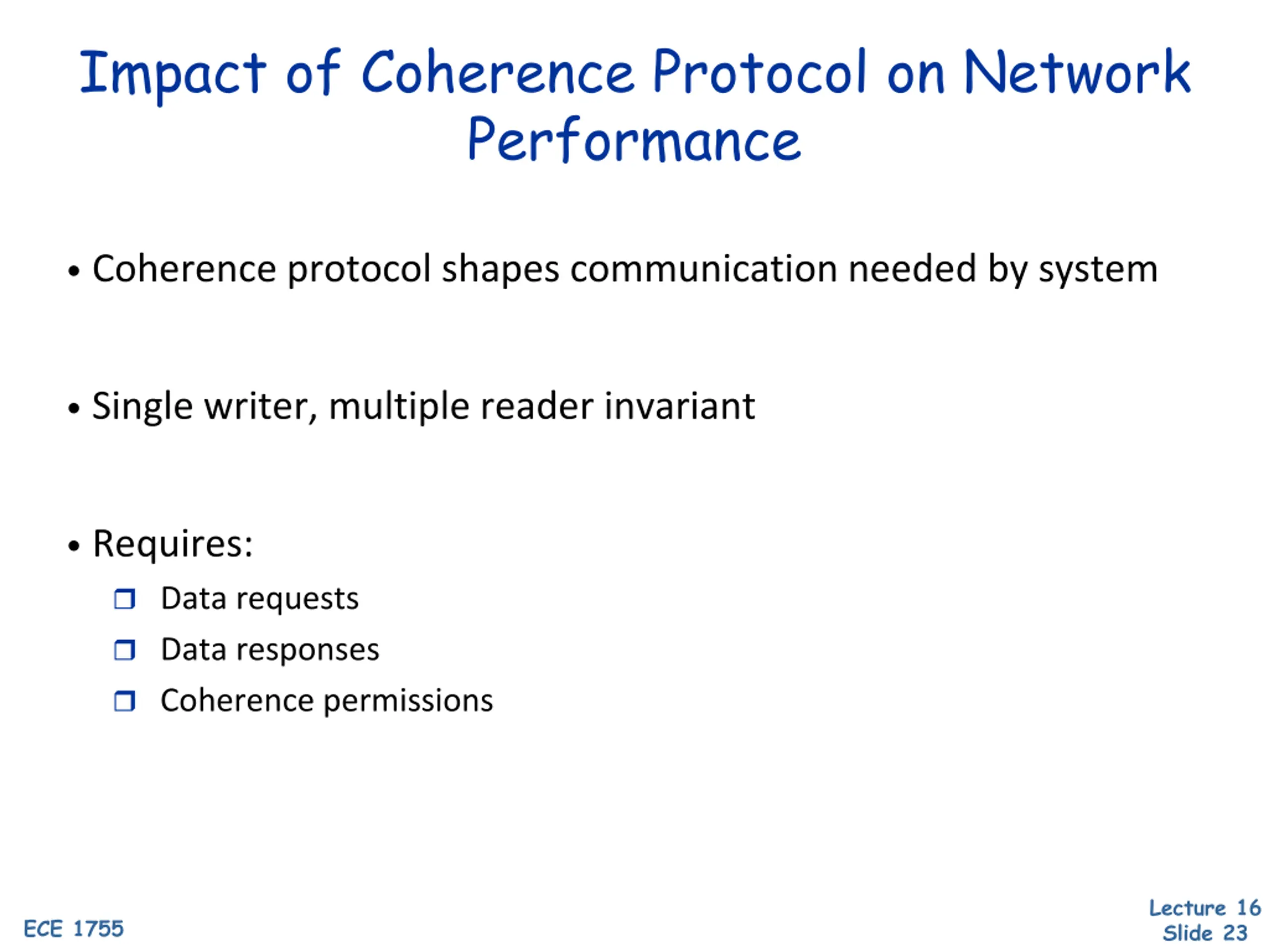 Impact of Coherence Protocol on Network Performance Coherence protocol shapes communication needed by system Single writer, multiple reader invariant Requires: Data requests Data responses Coherence permissions Lecture 16 Slide 23 ECE 1755