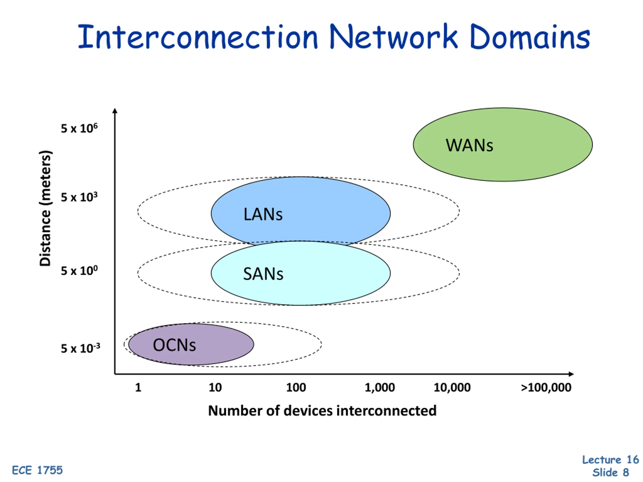 Interconnection Network Domains 5 x 106 WANs Distance (meters) 5 x 103 LANs 5 x 100 SANs OCNs 5 x 10-3 1 10 100 1,000 10,000 >100,000 Number of devices interconnected Lecture 16 Slide 8 ECE 1755