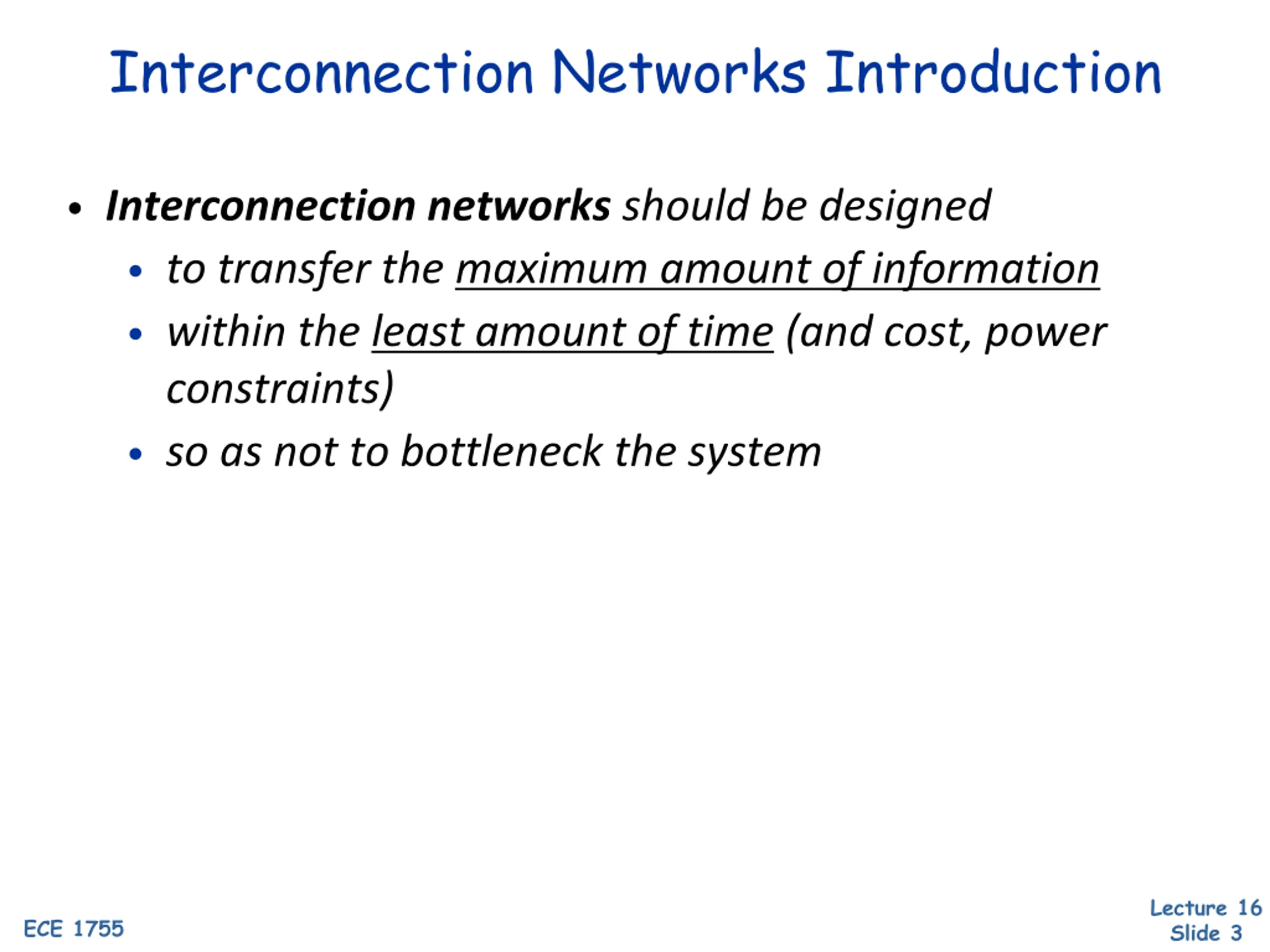 Interconnection Networks Introduction Interconnection networks should be designed to transfer the maximum amount of information within the least amount of time (and cost, power constraints) so as not to bottleneck the system Lecture 16 Slide 3 ECE 1755