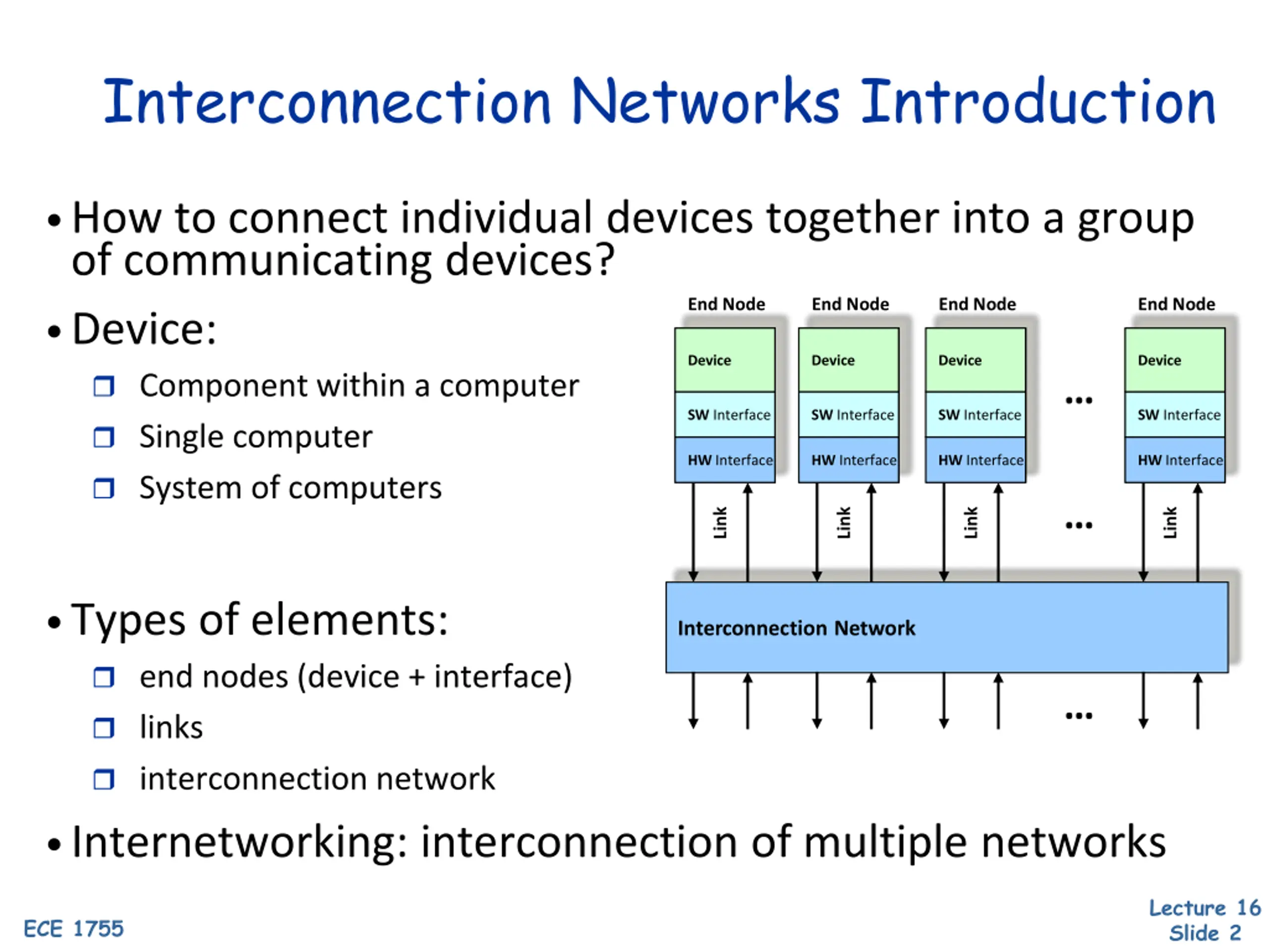 Interconnection Networks Introduction How to connect individual devices together into a group of communicating devices? Device: Component within a computer End Node End Node End Node End Node Device Device Device Device SW Interface SW Interface SW Interface SW Interface Single computer HW Interface HW Interface HW Interface HW Interface System of computers Link Link Link Link Types of elements: end nodes (device + interface) Interconnection Network links interconnection network Internetworking: interconnection of multiple networks Lecture 16 Slide 2 ECE 1755
