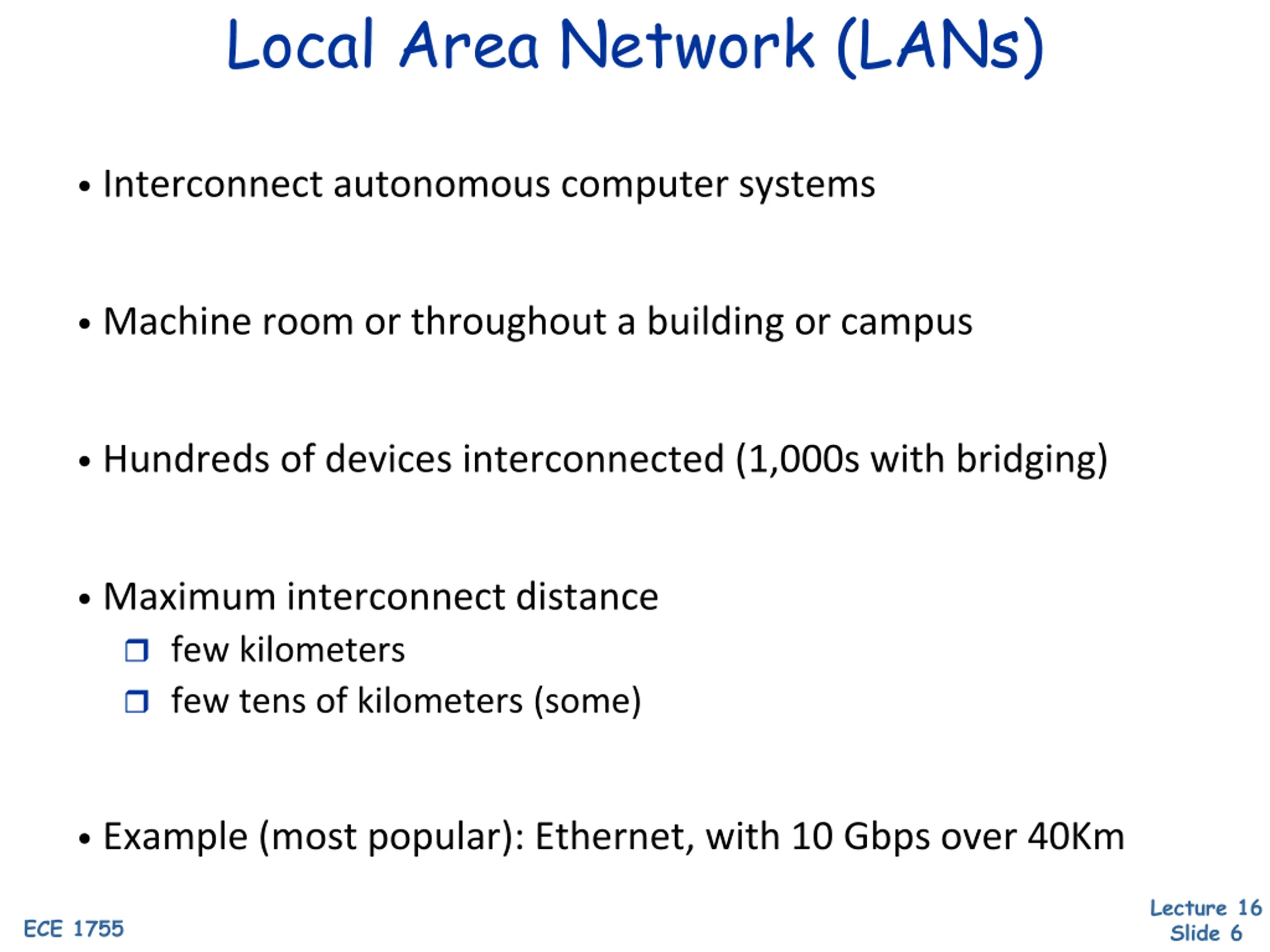 Local Area Network (LANs) Interconnect autonomous computer systems Machine room or throughout a building or campus Hundreds of devices interconnected (1,000s with bridging) Maximum interconnect distance few kilometers few tens of kilometers (some) Example (most popular): Ethernet, with 10 Gbps over 40Km Lecture 16 Slide 6 ECE 1755