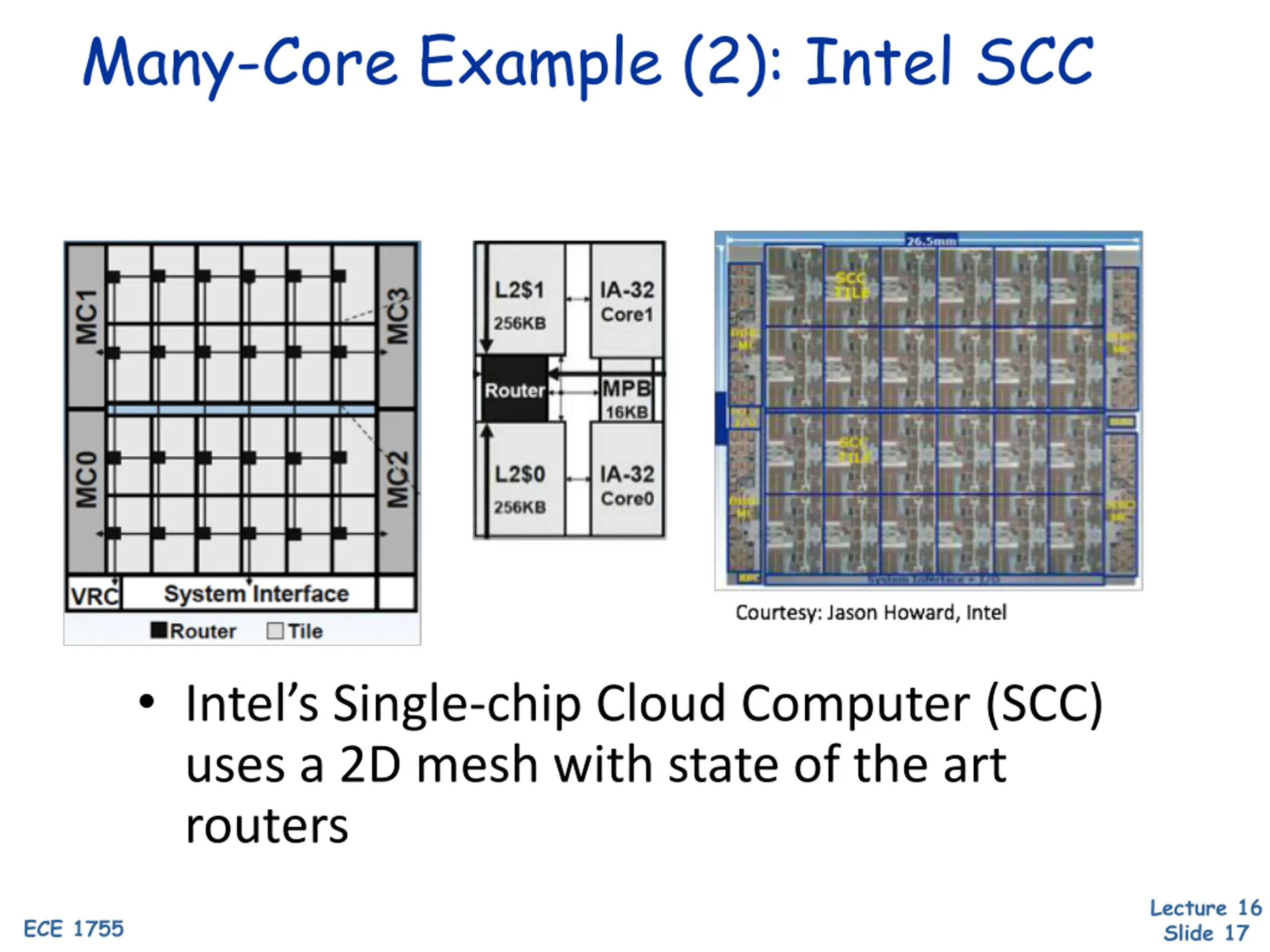 Many-Core Example (2): Intel SCC Intel s Single-chip Cloud Computer (SCC) uses a 2D mesh with state of the art routers Lecture 16 Slide 17 ECE 1755