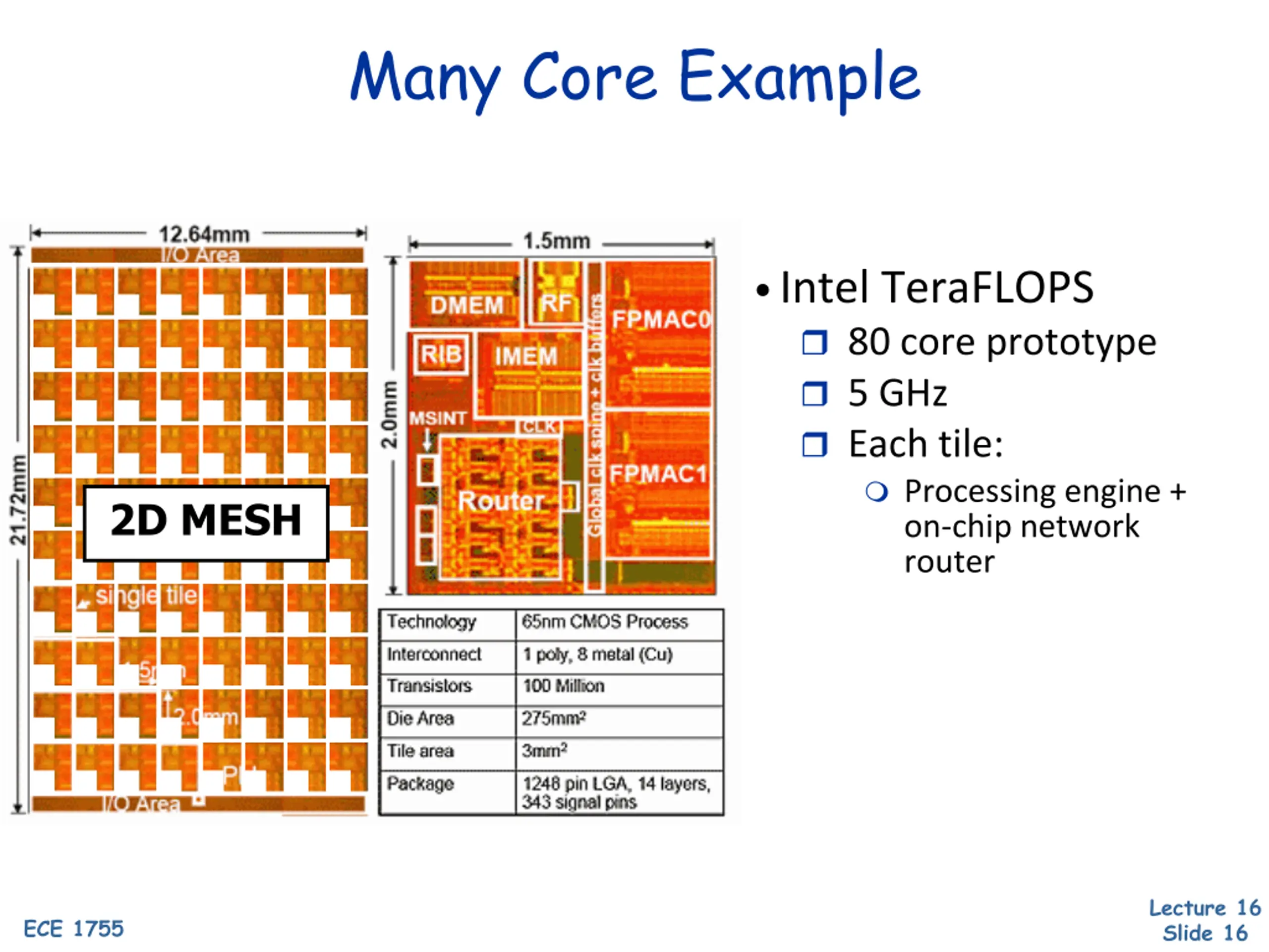 Many Core Example Intel TeraFLOPS 80 core prototype 5 GHz Each tile: Processing engine + on-chip network router 2D MESH Lecture 16 Slide 16 ECE 1755