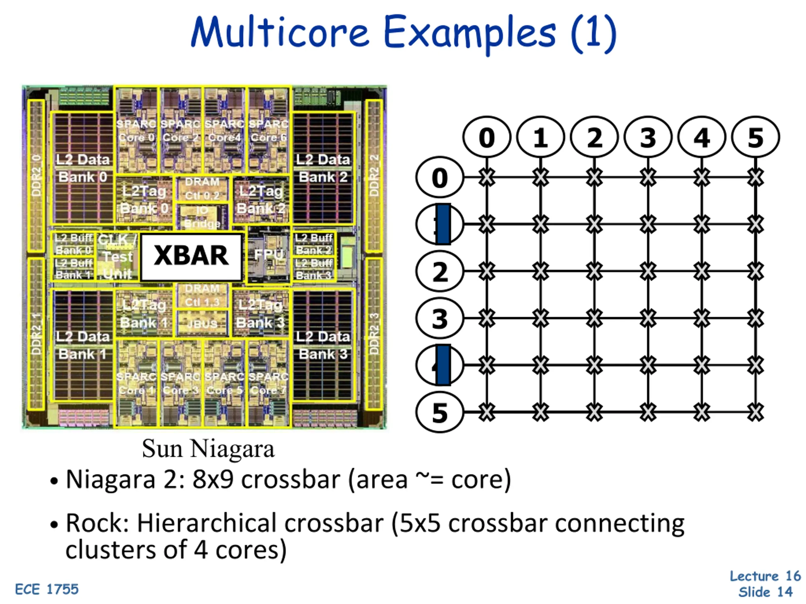 Multicore Examples (1) 0 1 2 3 4 5 0 1 XBAR 2 3 4 5 Sun Niagara Niagara 2: 8x9 crossbar (area ~= core) Rock: Hierarchical crossbar (5x5 crossbar connecting clusters of 4 cores) Lecture 16 Slide 14 ECE 1755