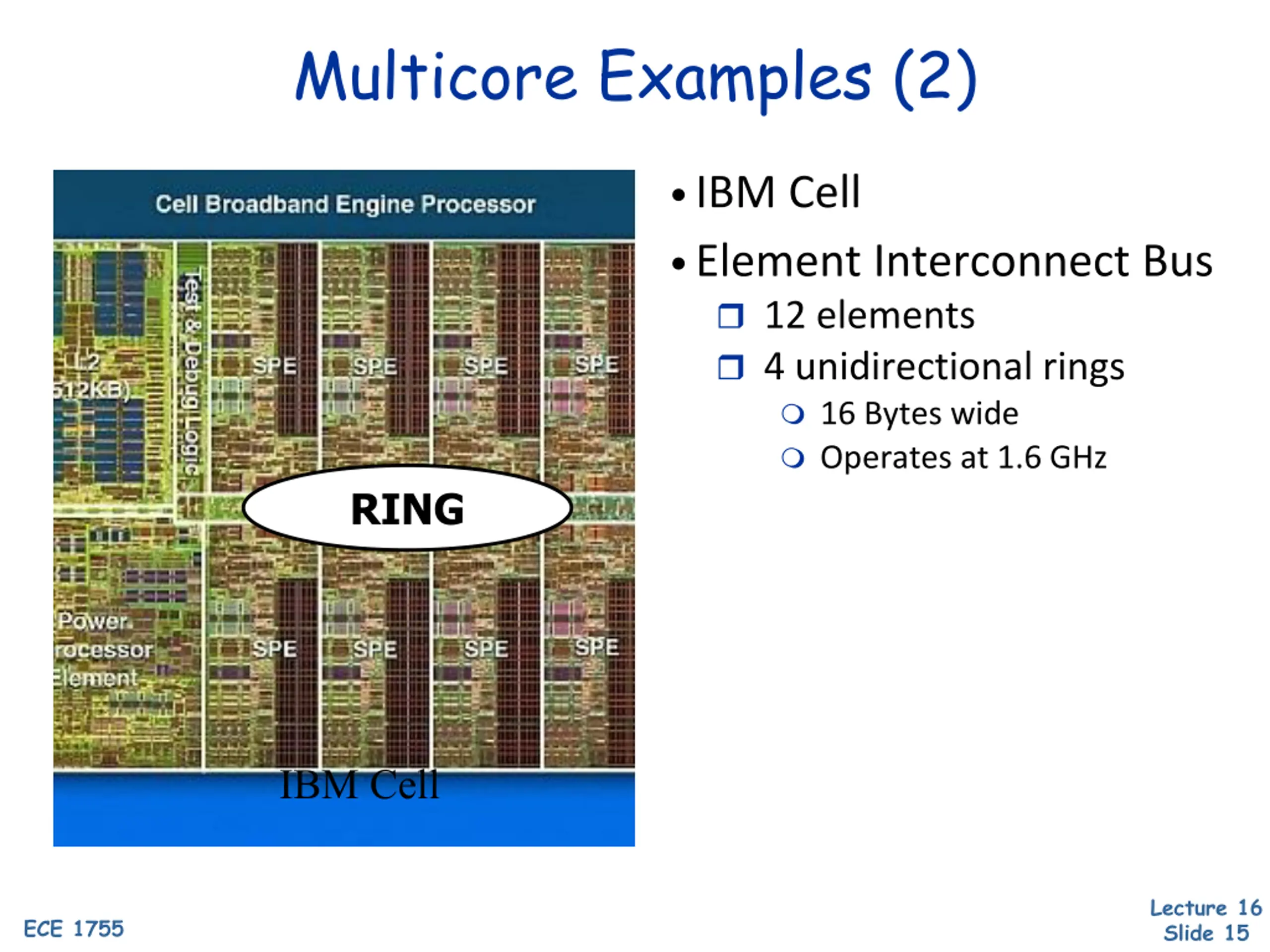 Multicore Examples (2) IBM Cell Element Interconnect Bus 12 elements 4 unidirectional rings 16 Bytes wide Operates at 1.6 GHz RING IBM Cell Lecture 16 Slide 15 ECE 1755
