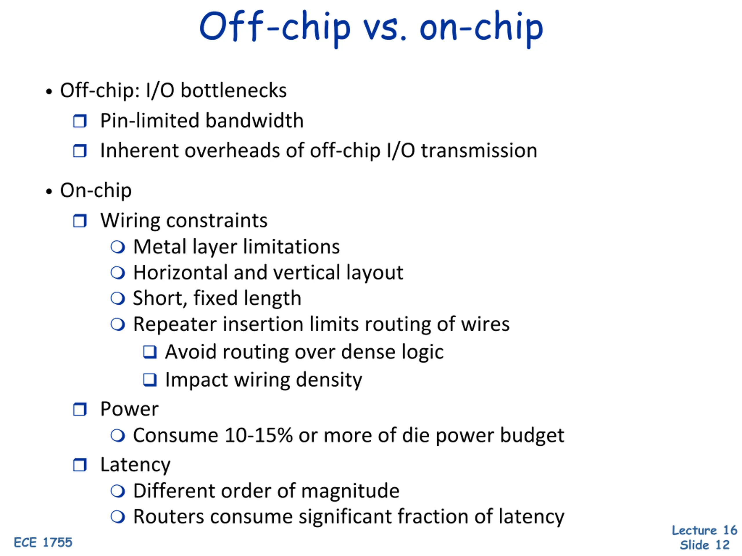 Off-chip vs. on-chip Off-chip: I/O bottlenecks Pin-limited bandwidth Inherent overheads of off-chip I/O transmission On-chip Wiring constraints Metal layer limitations Horizontal and vertical layout Short, fixed length Repeater insertion limits routing of wires Avoid routing over dense logic Impact wiring density Power Consume 10-15% or more of die power budget Latency Different order of magnitude Routers consume significant fraction of latency Lecture 16 Slide 12 ECE 1755