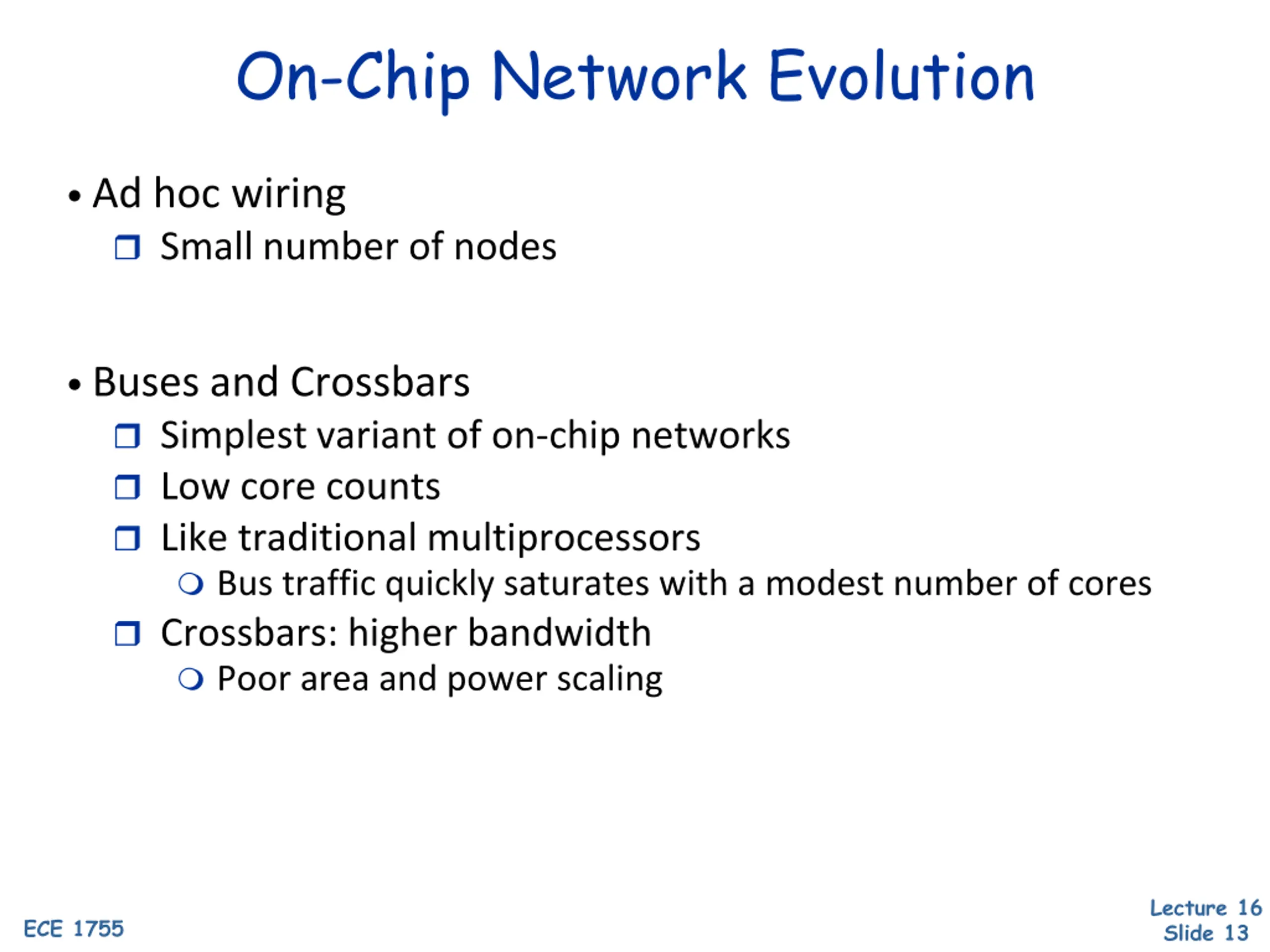 On-Chip Network Evolution Ad hoc wiring Small number of nodes Buses and Crossbars Simplest variant of on-chip networks Low core counts Like traditional multiprocessors Bus traffic quickly saturates with a modest number of cores Crossbars: higher bandwidth Poor area and power scaling Lecture 16 Slide 13 ECE 1755