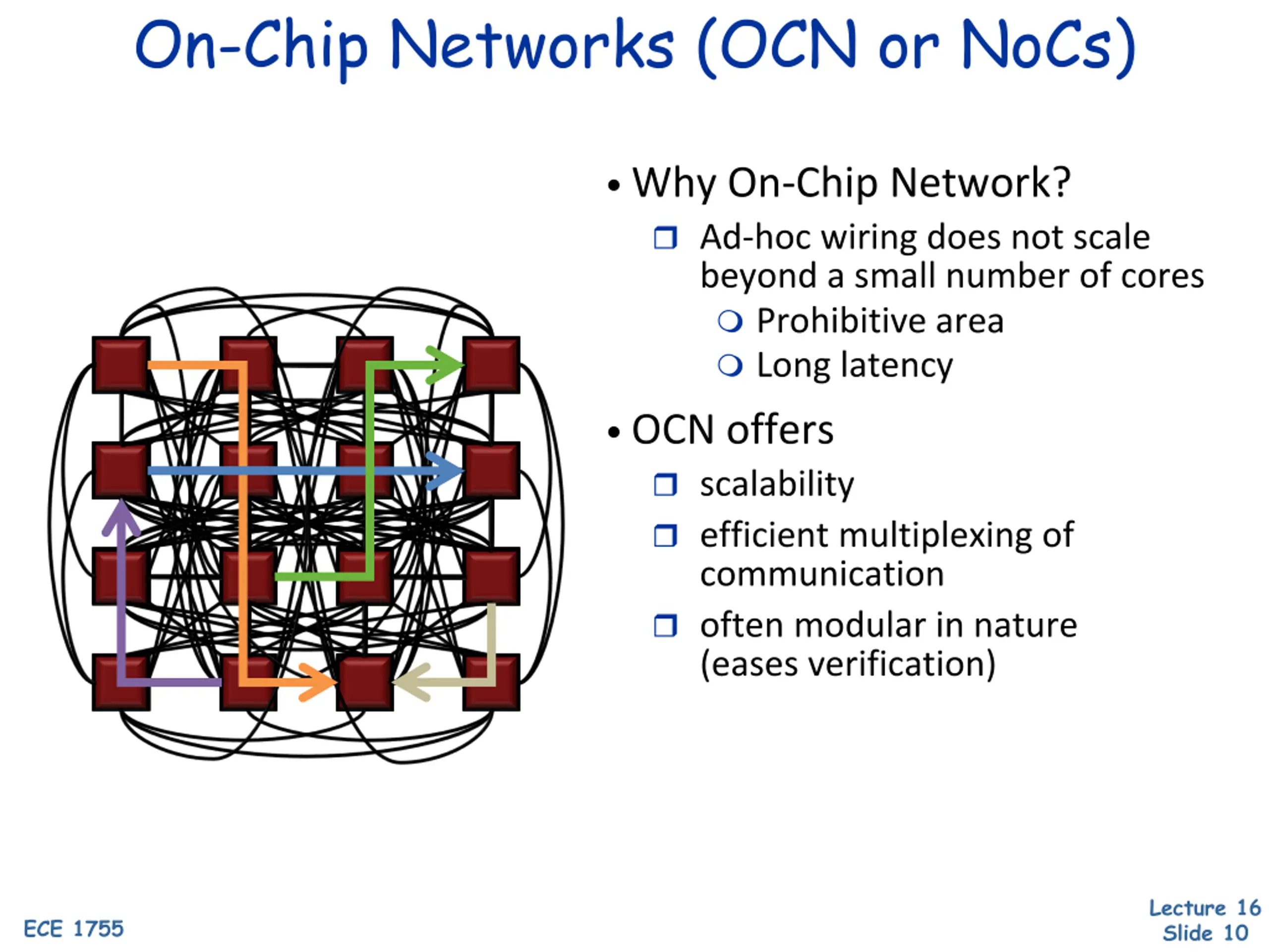 On-Chip Networks (OCN or NoCs) Why On-Chip Network? Ad-hoc wiring does not scale beyond a small number of cores Prohibitive area Long latency OCN offers scalability efficient multiplexing of communication often modular in nature (eases verification) Lecture 16 Slide 10 ECE 1755