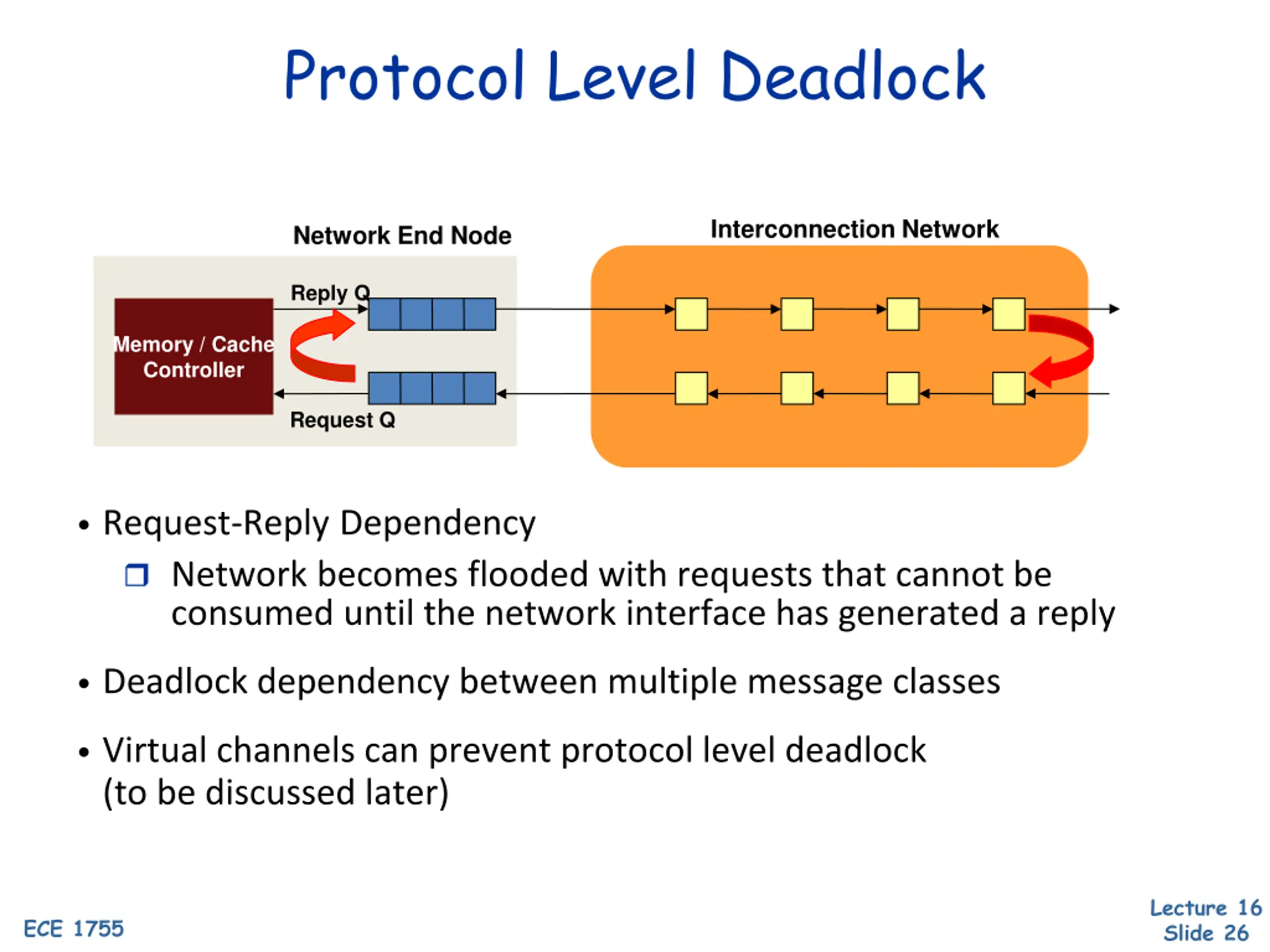 Protocol Level Deadlock Interconnection Network Network End Node Reply Q Memory / Cache Controller Request Q Request-Reply Dependency Network becomes flooded with requests that cannot be consumed until the network interface has generated a reply Deadlock dependency between multiple message classes Virtual channels can prevent protocol level deadlock (to be discussed later) Lecture 16 Slide 26 ECE 1755