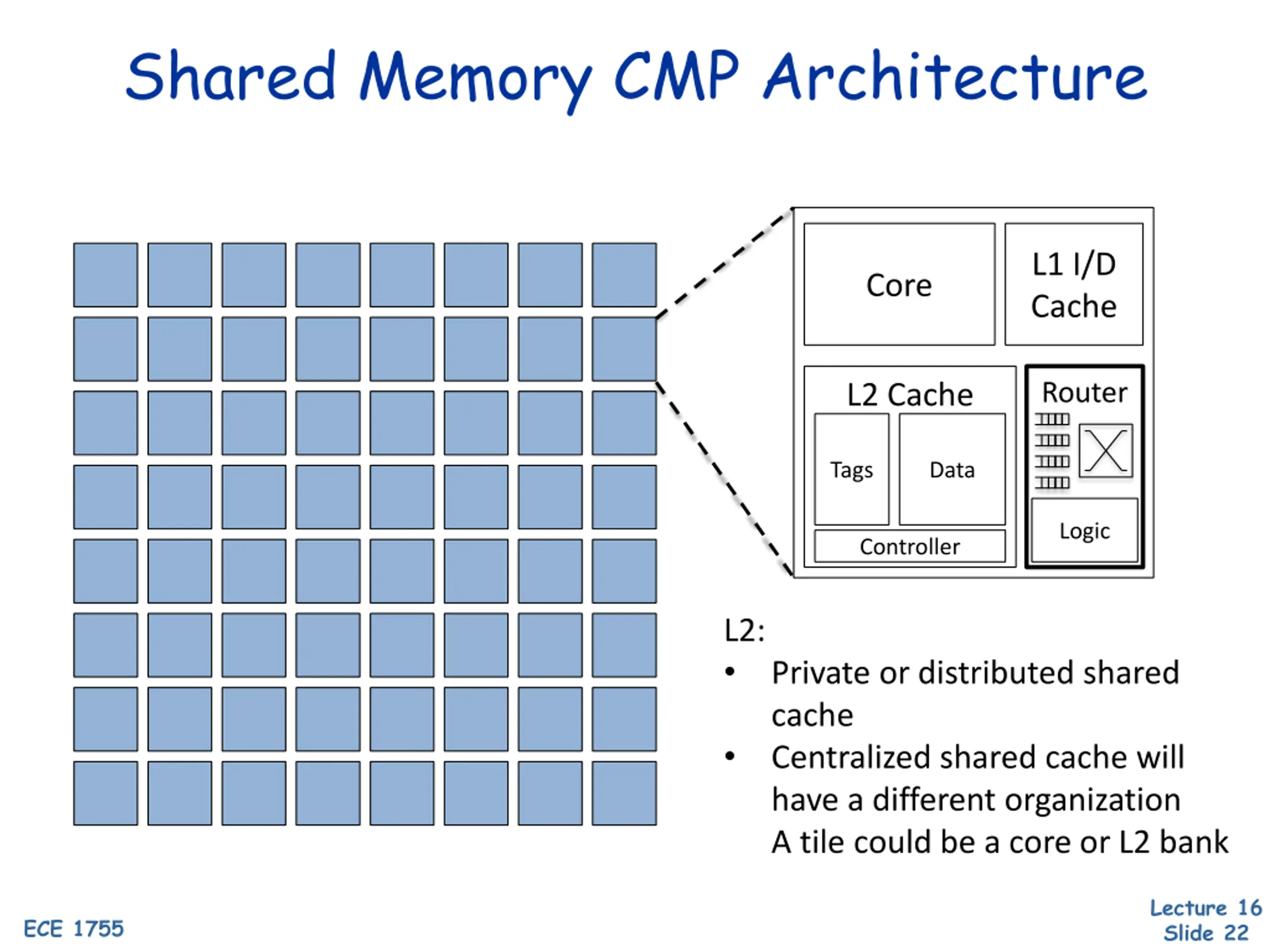 Shared Memory CMP Architecture L1 I/D Cache Core Router L2 Cache Tags Data Logic Controller L2: Private or distributed shared cache Centralized shared cache will have a different organization A tile could be a core or L2 bank Lecture 16 Slide 22 ECE 1755