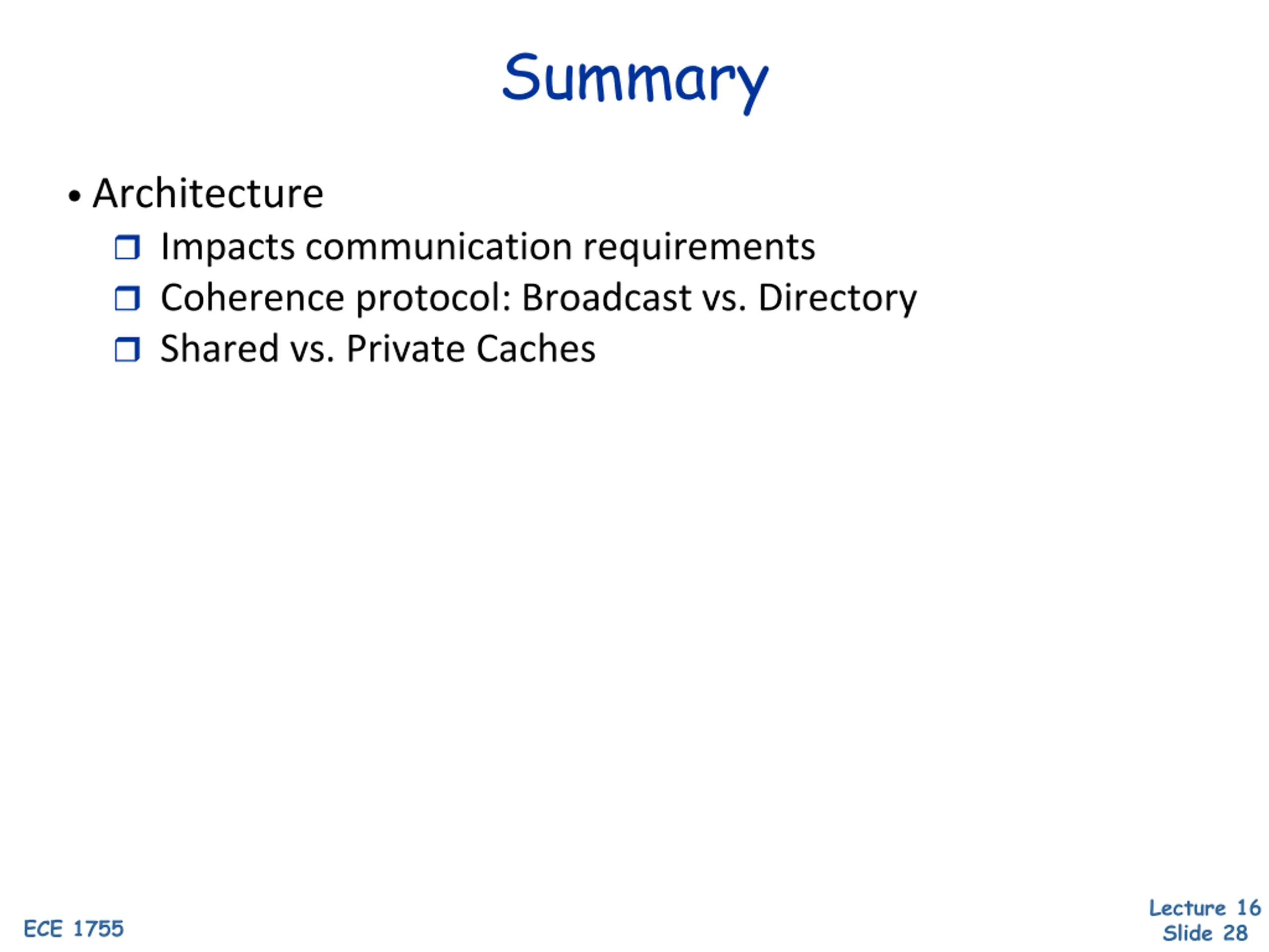 Summary Architecture Impacts communication requirements Coherence protocol: Broadcast vs. Directory Shared vs. Private Caches Lecture 16 Slide 28 ECE 1755