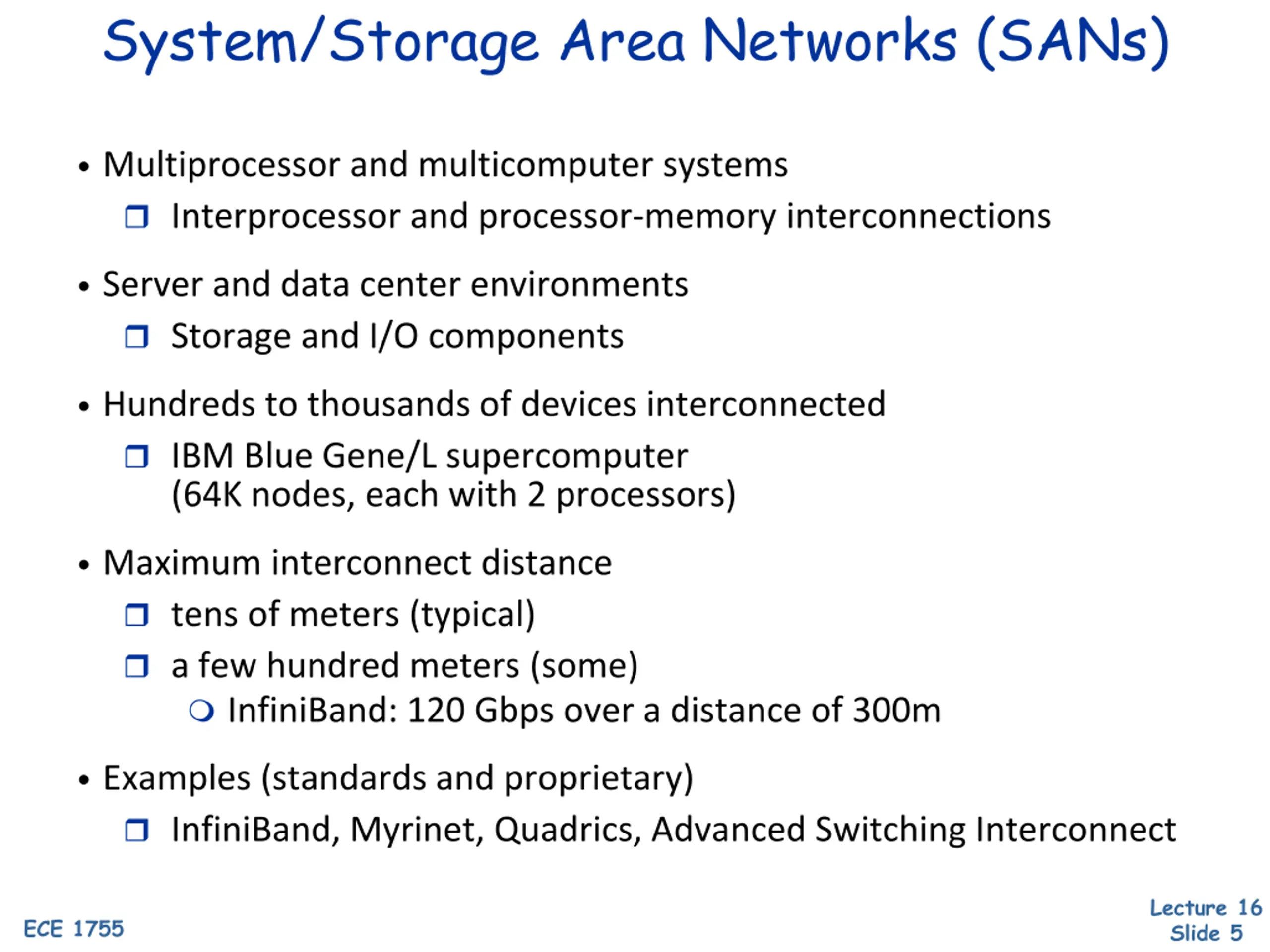 System/Storage Area Networks (SANs) Multiprocessor and multicomputer systems Interprocessor and processor-memory interconnections Server and data center environments Storage and I/O components Hundreds to thousands of devices interconnected IBM Blue Gene/L supercomputer (64K nodes, each with 2 processors) Maximum interconnect distance tens of meters (typical) a few hundred meters (some) InfiniBand: 120 Gbps over a distance of 300m Examples (standards and proprietary) InfiniBand, Myrinet, Quadrics, Advanced Switching Interconnect Lecture 16 Slide 5 ECE 1755