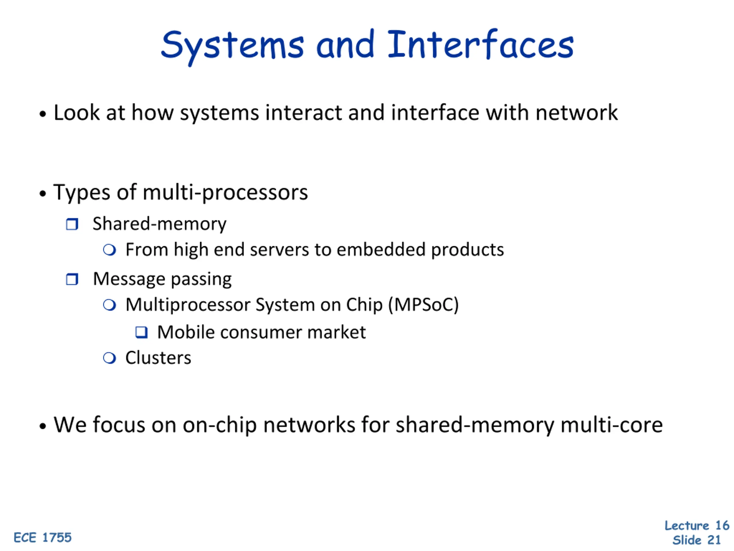 Systems and Interfaces Look at how systems interact and interface with network Types of multi-processors Shared-memory From high end servers to embedded products Message passing Multiprocessor System on Chip (MPSoC) Mobile consumer market Clusters We focus on on-chip networks for shared-memory multi-core Lecture 16 Slide 21 ECE 1755