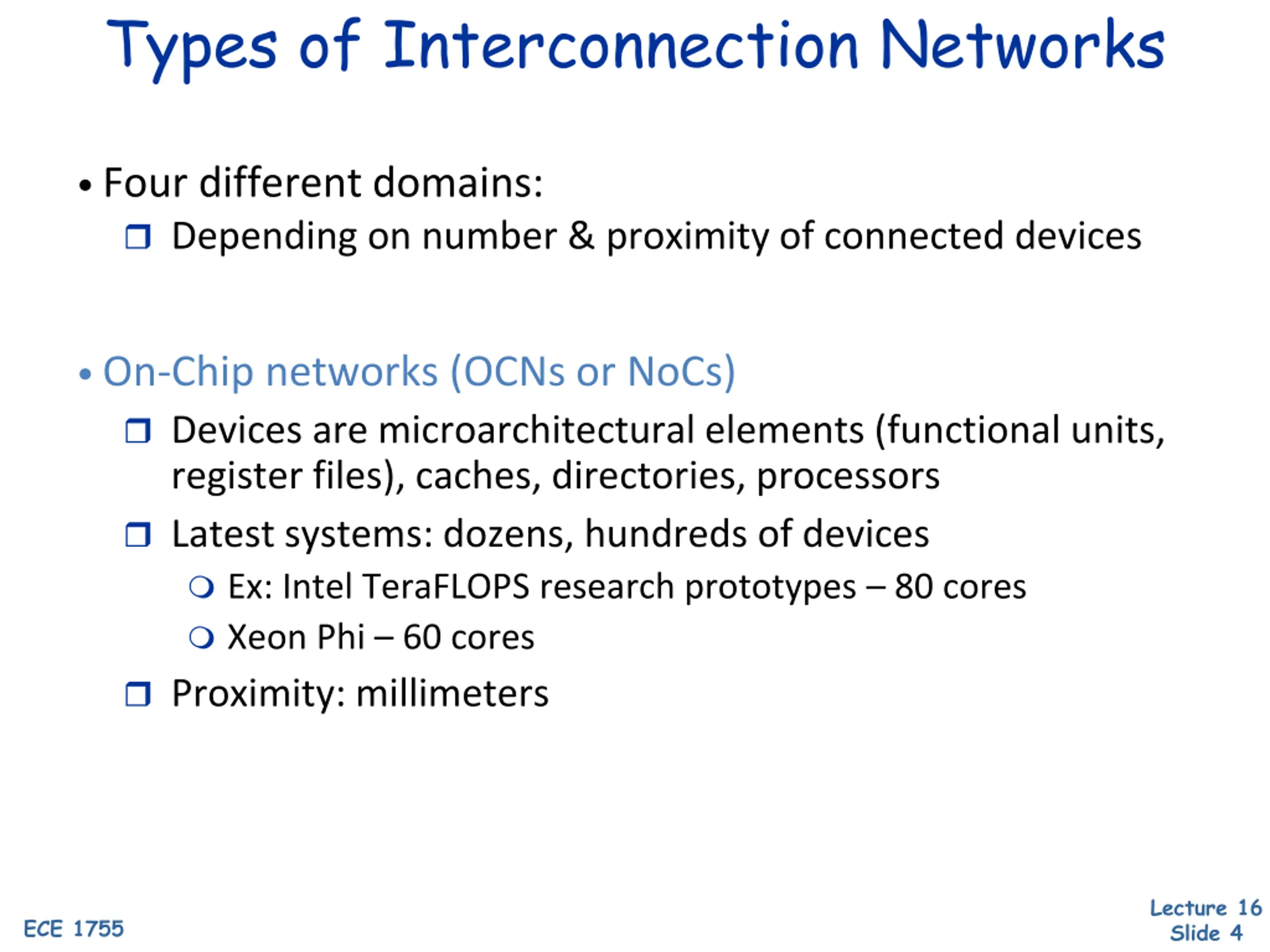 Types of Interconnection Networks Four different domains: Depending on number & proximity of connected devices On-Chip networks (OCNs or NoCs) Devices are microarchitectural elements (functional units, register files), caches, directories, processors Latest systems: dozens, hundreds of devices Ex: Intel TeraFLOPS research prototypes 80 cores Xeon Phi 60 cores Proximity: millimeters Lecture 16 Slide 4 ECE 1755