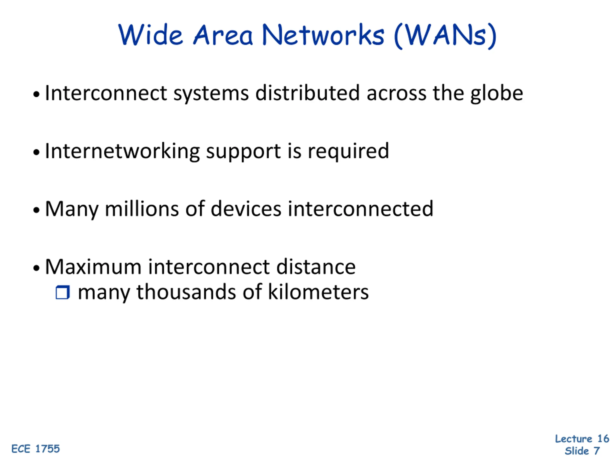 Wide Area Networks (WANs) Interconnect systems distributed across the globe Internetworking support is required Many millions of devices interconnected Maximum interconnect distance many thousands of kilometers Lecture 16 Slide 7 ECE 1755