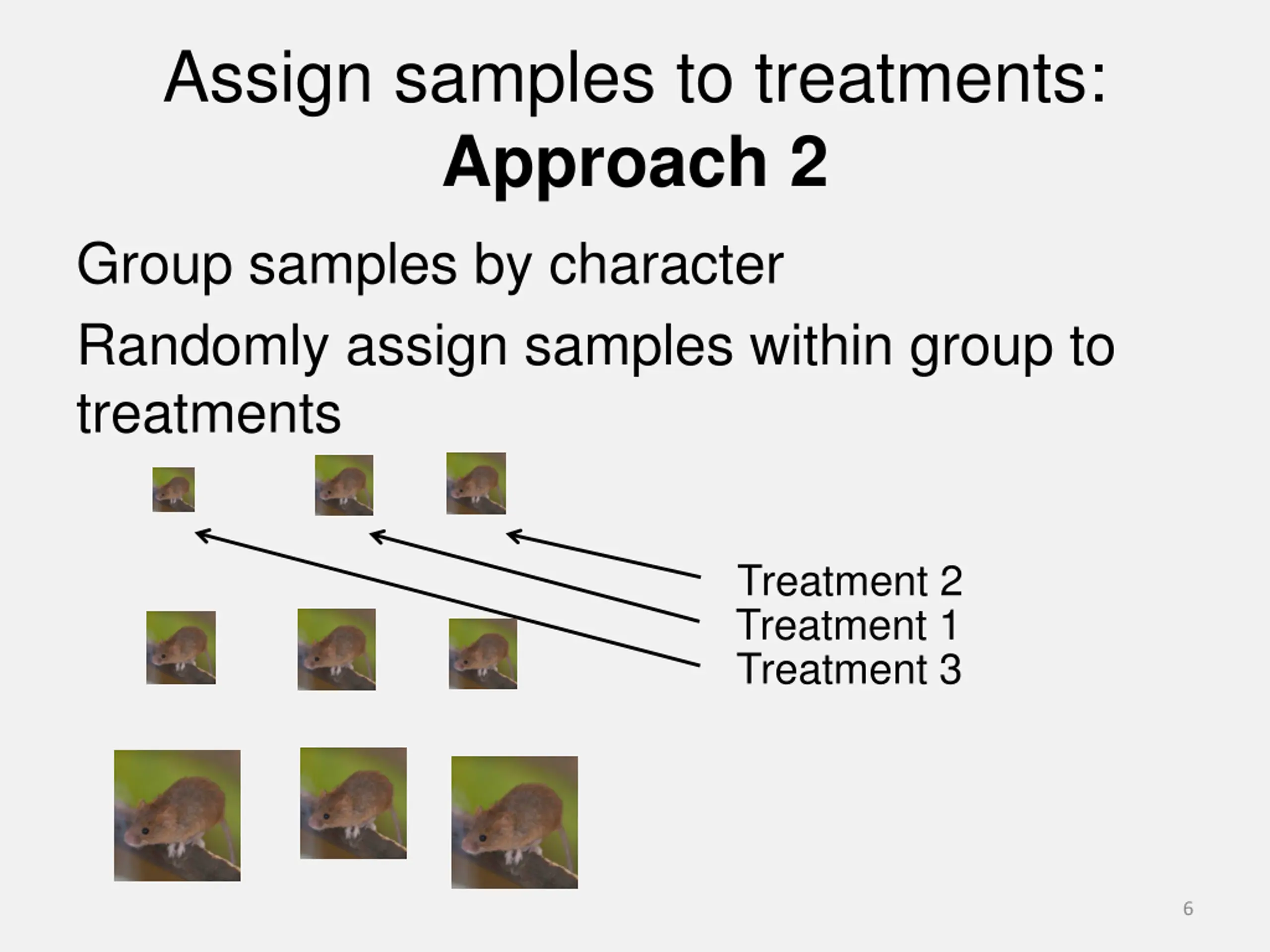 Assign samples to treatments: Approach 1 Randomly assign samples to treatments Treatment 1 Treatment 2 Treatment 3 Why is random important? THINK 5