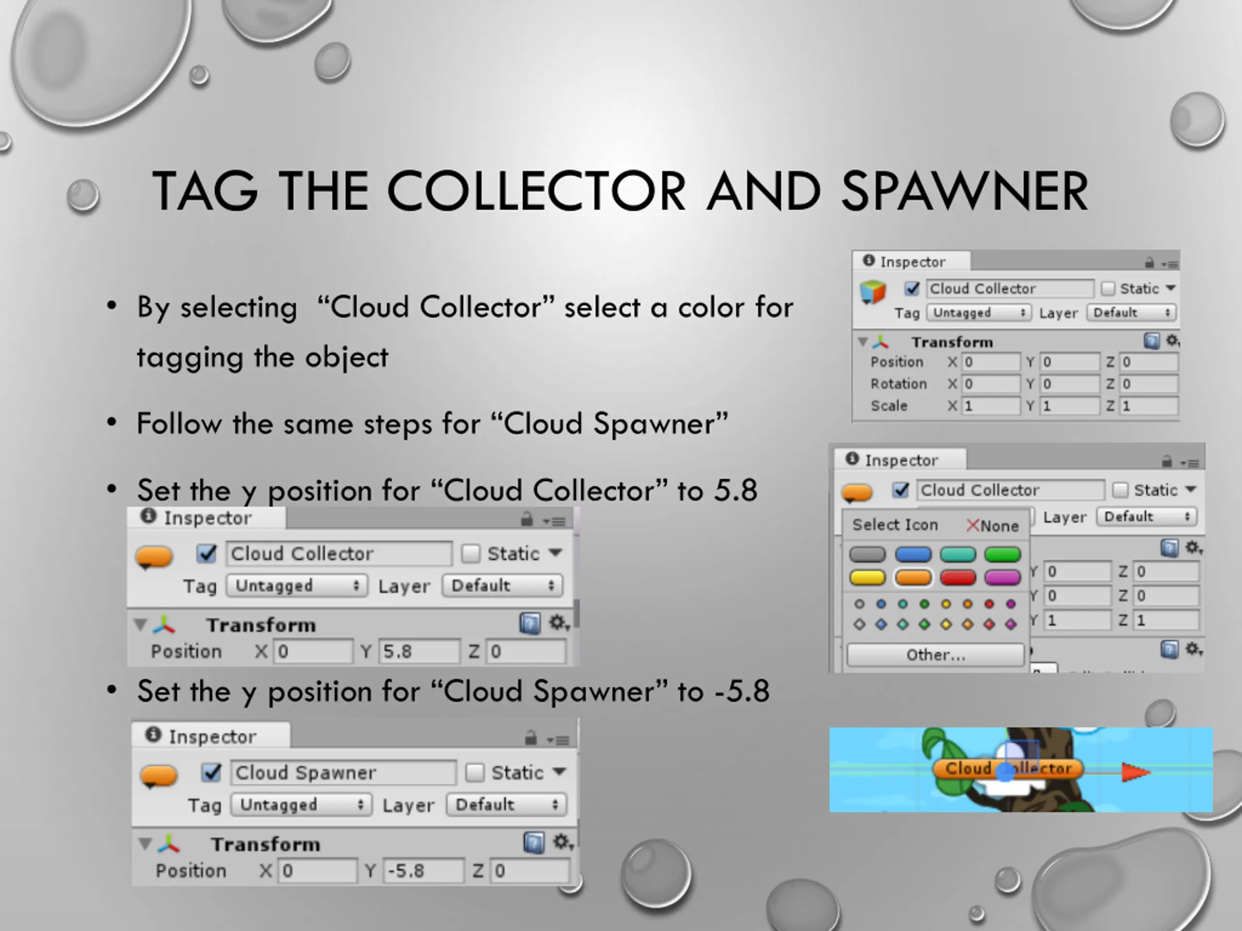 TAG THE COLLECTOR AND SPAWNER By selecting Cloud Collector select a color for tagging the object Follow the same steps for Cloud Spawner Set the y position for Cloud Collector to 5.8 Set the y position for Cloud Spawner to -5.8