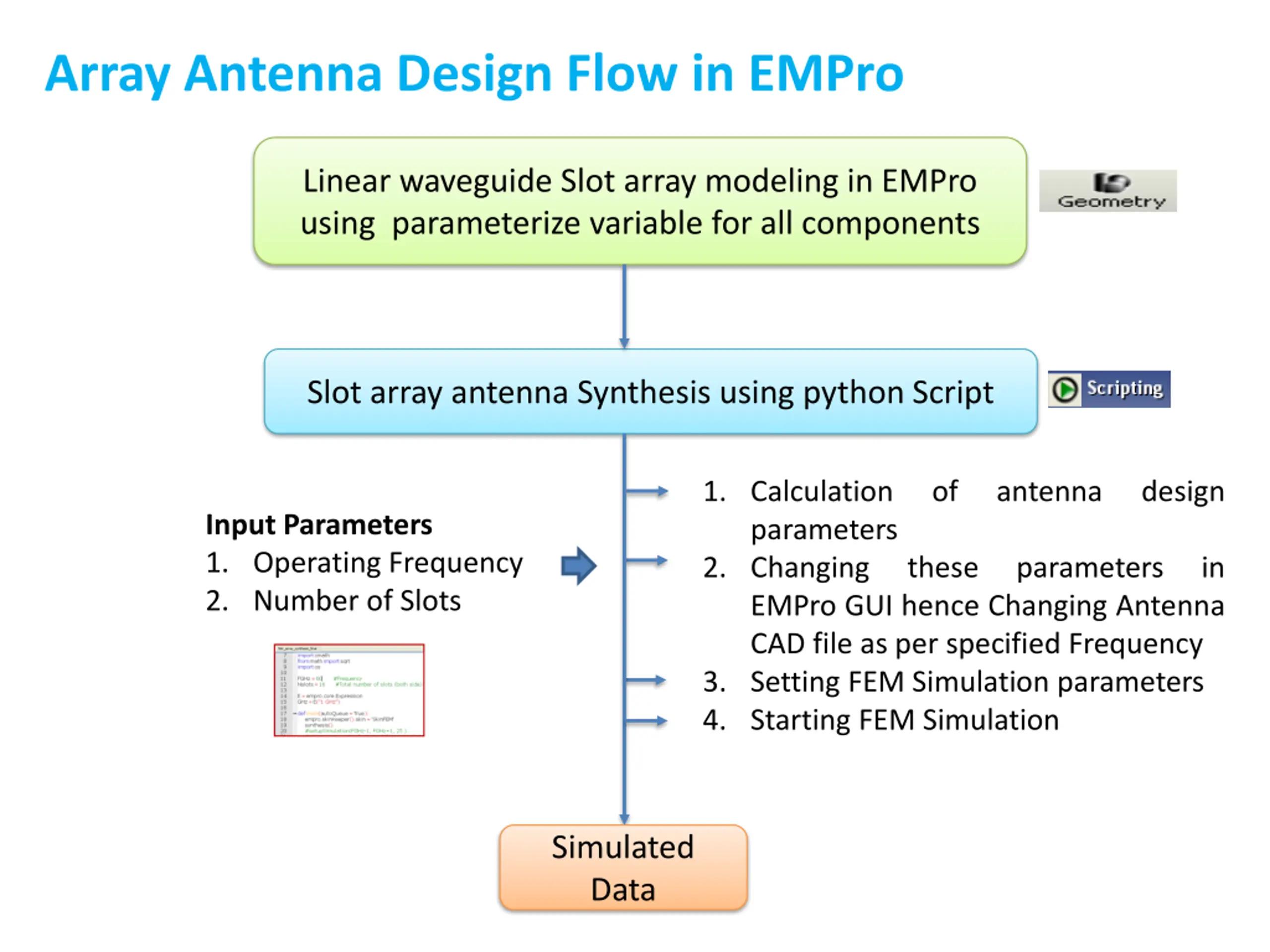 Array Antenna Design Flow in EMPro Linear waveguide Slot array modeling in EMPro using parameterize variable for all components Slot array antenna Synthesis using python Script 1. Calculation parameters 2. Changing EMPro GUI hence Changing Antenna CAD file as per specified Frequency 3. Setting FEM Simulation parameters 4. Starting FEM Simulation of antenna design Input Parameters 1. Operating Frequency 2. Number of Slots these parameters in Simulated Data