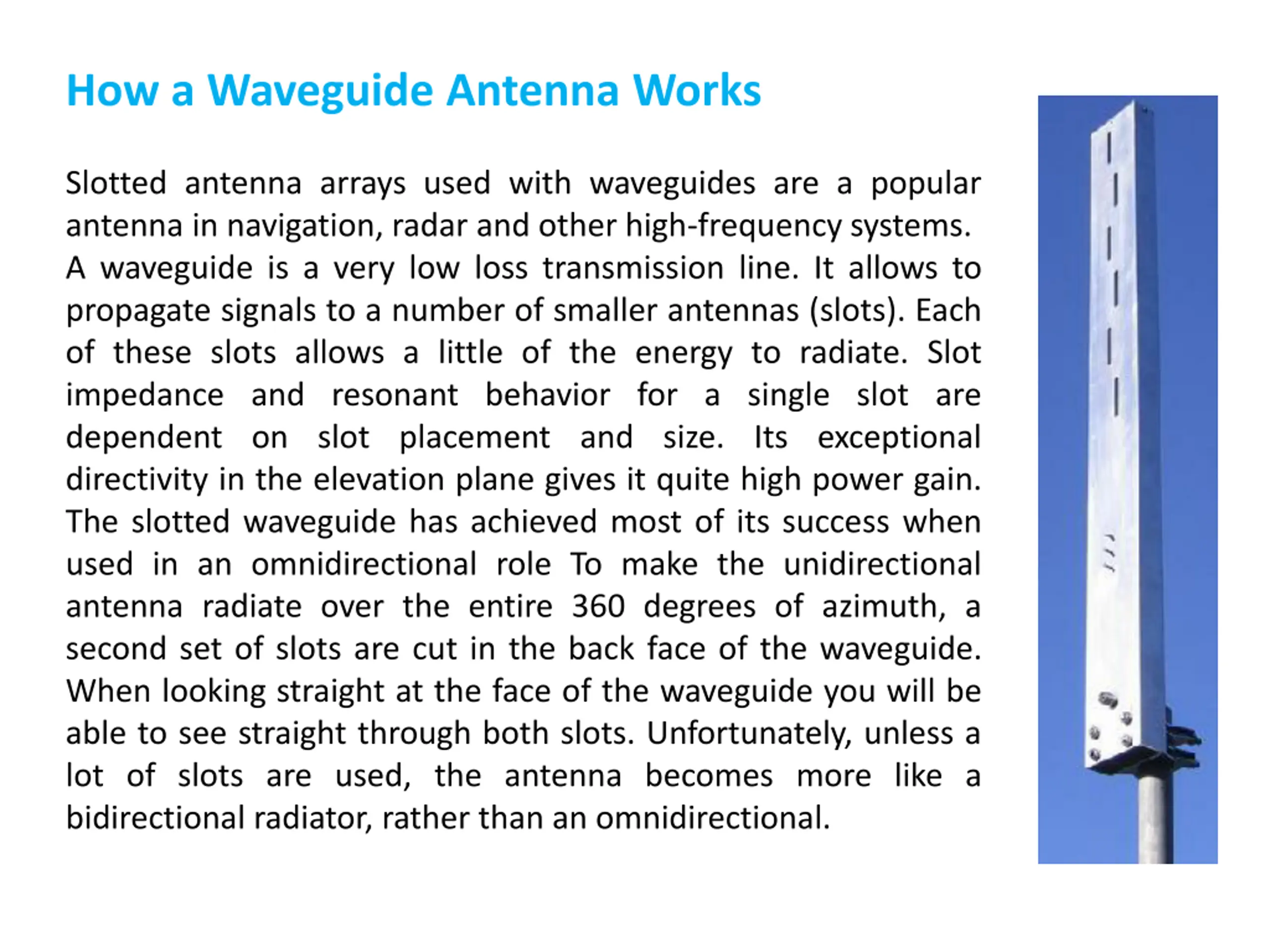 How a Waveguide Antenna Works Slotted antenna arrays used with waveguides are a popular antenna in navigation, radar and other high-frequency systems. A waveguide is a very low loss transmission line. It allows to propagate signals to a number of smaller antennas (slots). Each of these slots allows a little of the energy to radiate. Slot impedance and resonant behavior for a single slot are dependent on slot placement and size. Its exceptional directivity in the elevation plane gives it quite high power gain. The slotted waveguide has achieved most of its success when used in an omnidirectional role To make the unidirectional antenna radiate over the entire 360 degrees of azimuth, a second set of slots are cut in the back face of the waveguide. When looking straight at the face of the waveguide you will be able to see straight through both slots. Unfortunately, unless a lot of slots are used, the antenna becomes more like a bidirectional radiator, rather than an omnidirectional.