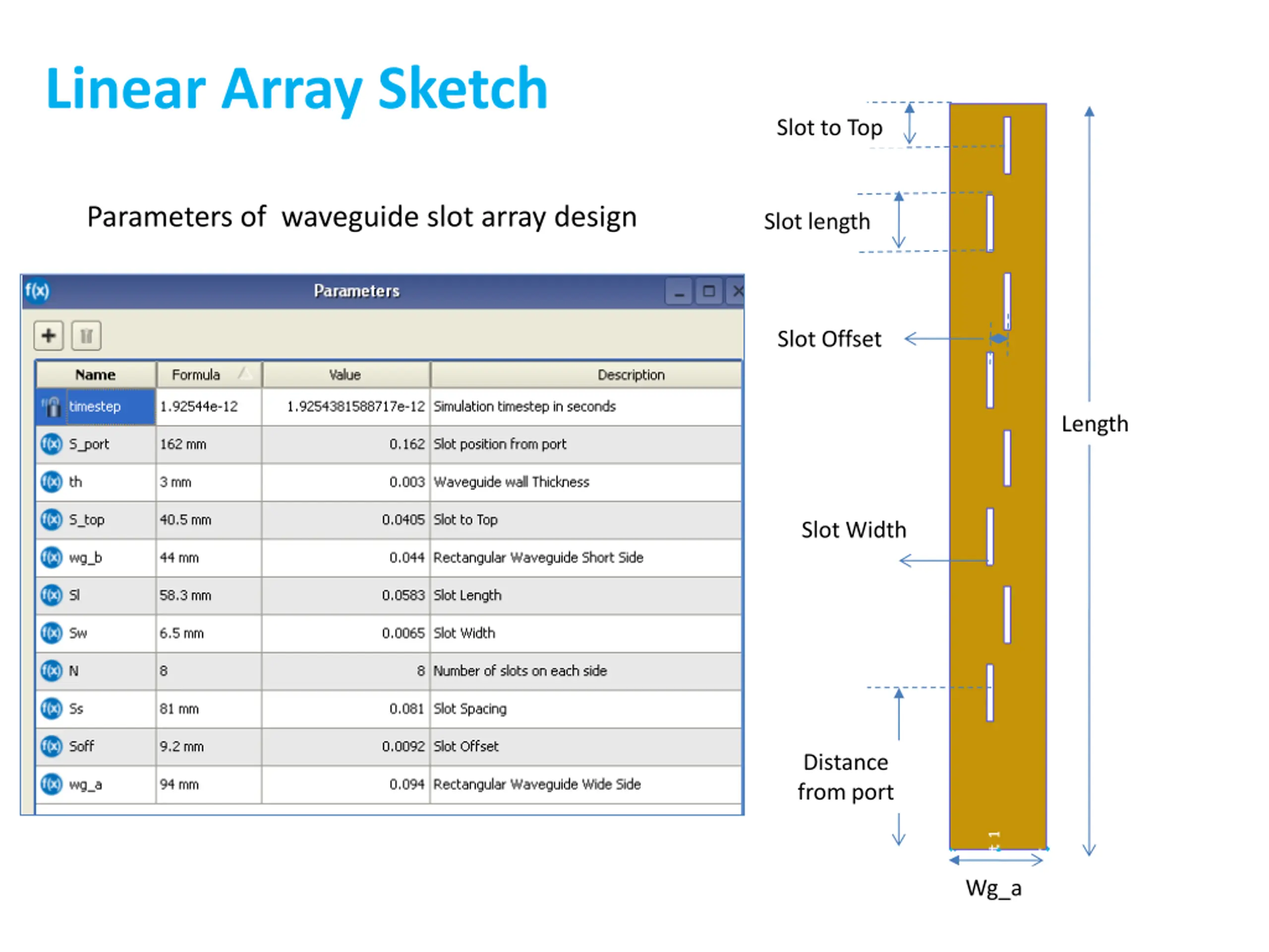 Linear Array Sketch Slot to Top Parameters of waveguide slot array design Slot length Slot Offset Length Slot Width Distance from port Wg_a