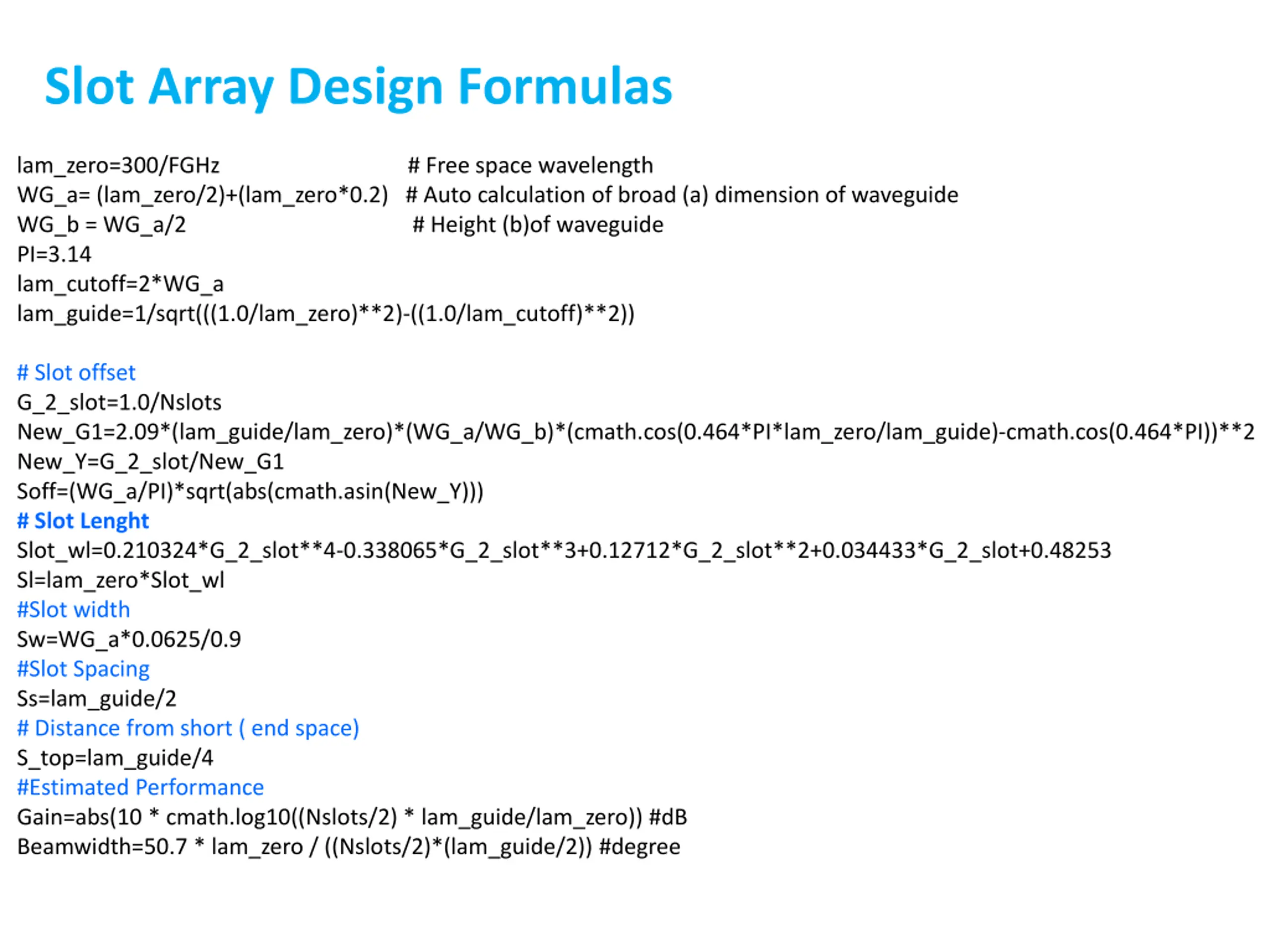 Slot Array Design Formulas lam_zero=300/FGHz # Free space wavelength WG_a= (lam_zero/2)+(lam_zero*0.2) # Auto calculation of broad (a) dimension of waveguide WG_b = WG_a/2 # Height (b)of waveguide PI=3.14 lam_cutoff=2*WG_a lam_guide=1/sqrt(((1.0/lam_zero)**2)-((1.0/lam_cutoff)**2)) # Slot offset G_2_slot=1.0/Nslots New_G1=2.09*(lam_guide/lam_zero)*(WG_a/WG_b)*(cmath.cos(0.464*PI*lam_zero/lam_guide)-cmath.cos(0.464*PI))**2 New_Y=G_2_slot/New_G1 Soff=(WG_a/PI)*sqrt(abs(cmath.asin(New_Y))) # Slot Lenght Slot_wl=0.210324*G_2_slot**4-0.338065*G_2_slot**3+0.12712*G_2_slot**2+0.034433*G_2_slot+0.48253 Sl=lam_zero*Slot_wl #Slot width Sw=WG_a*0.0625/0.9 #Slot Spacing Ss=lam_guide/2 # Distance from short ( end space) S_top=lam_guide/4 #Estimated Performance Gain=abs(10 * cmath.log10((Nslots/2) * lam_guide/lam_zero)) #dB Beamwidth=50.7 * lam_zero / ((Nslots/2)*(lam_guide/2)) #degree