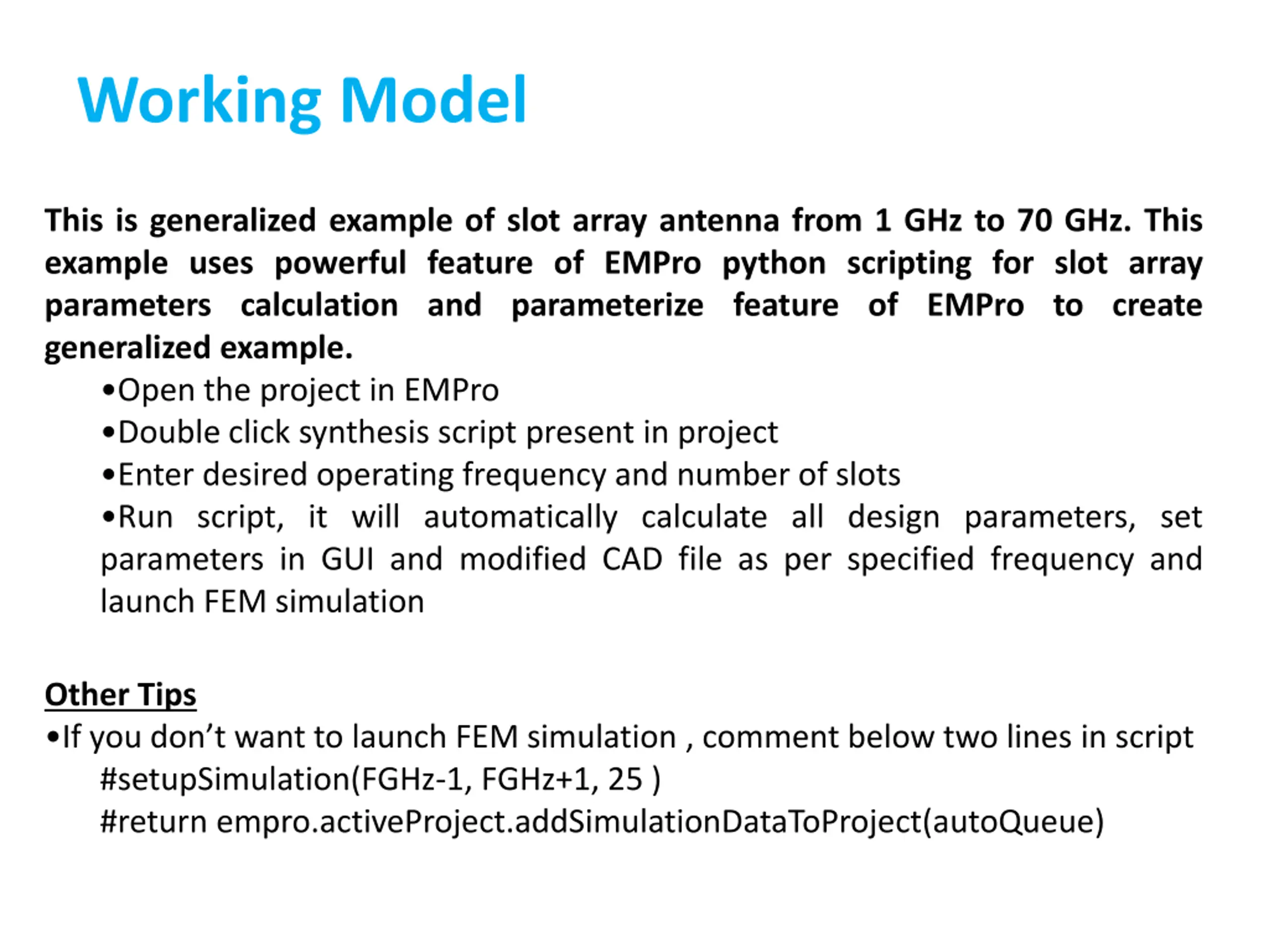 Working Model This is generalized example of slot array antenna from 1 GHz to 70 GHz. This example uses powerful feature of EMPro python scripting for slot array parameters calculation and parameterize feature of EMPro to create generalized example. Open the project in EMPro Double click synthesis script present in project Enter desired operating frequency and number of slots Run script, it will automatically calculate all design parameters, set parameters in GUI and modified CAD file as per specified frequency and launch FEM simulation Other Tips If you don t want to launch FEM simulation , comment below two lines in script #setupSimulation(FGHz-1, FGHz+1, 25 ) #return empro.activeProject.addSimulationDataToProject(autoQueue)