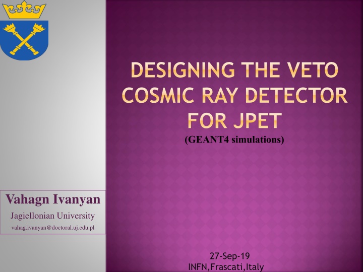 DESIGNING THE VETO COSMIC RAY DETECTOR FOR JPET (GEANT4 simulations) Vahagn Ivanyan Jagiellonian University vahag.ivanyan@doctoral.uj.edu.pl 27-Sep-19 INFN,Frascati,Italy