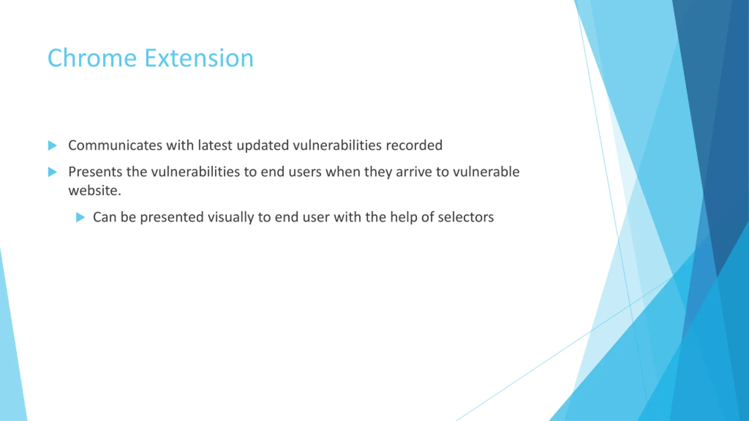Chrome Extension Communicates with latest updated vulnerabilities recorded Presents the vulnerabilities to end users when they arrive to vulnerable website. Can be presented visually to end user with the help of selectors