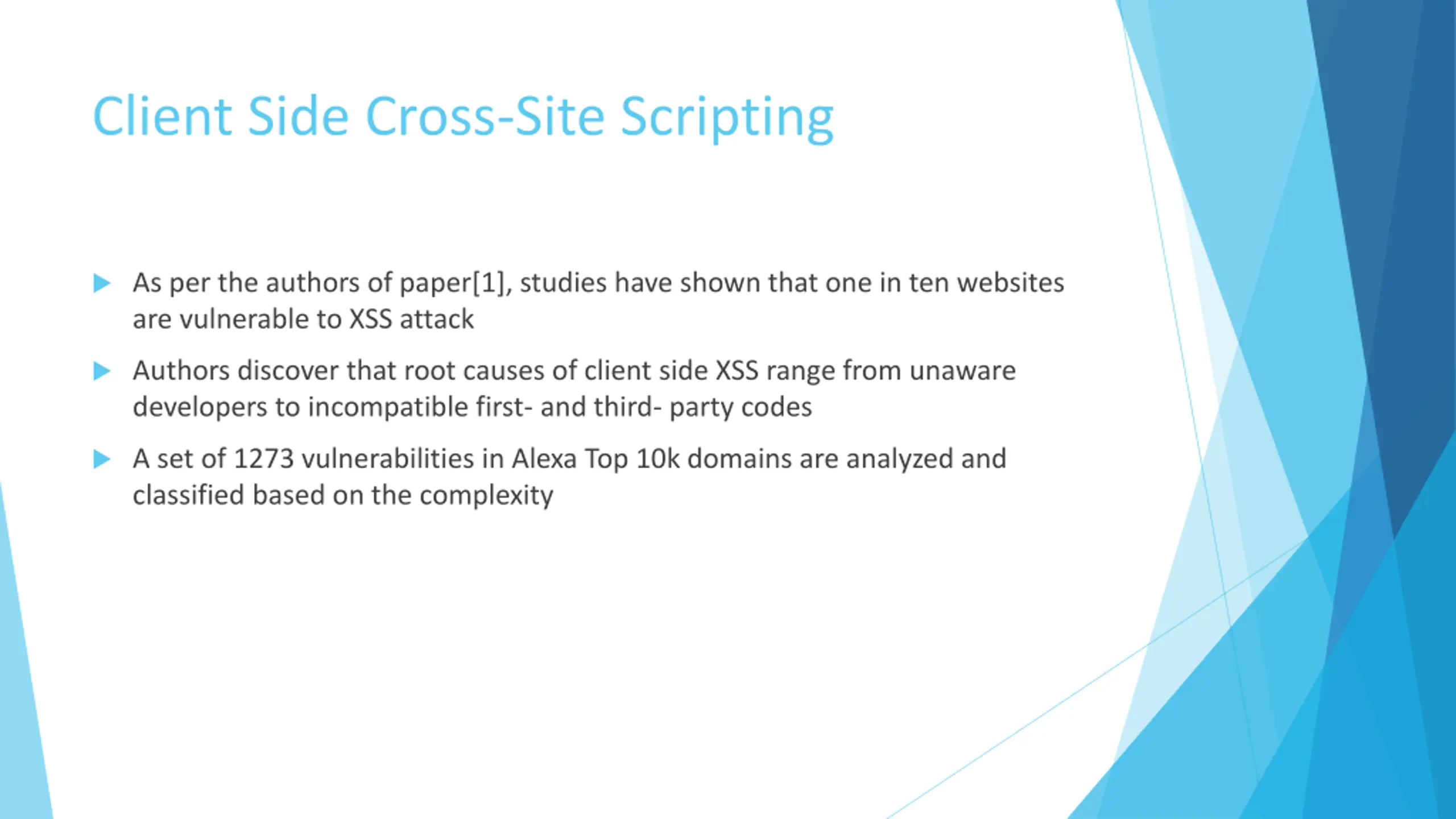 Client Side Cross-Site Scripting As per the authors of paper[1], studies have shown that one in ten websites are vulnerable to XSS attack Authors discover that root causes of client side XSS range from unaware developers to incompatible first- and third- party codes A set of 1273 vulnerabilities in Alexa Top 10k domains are analyzed and classified based on the complexity