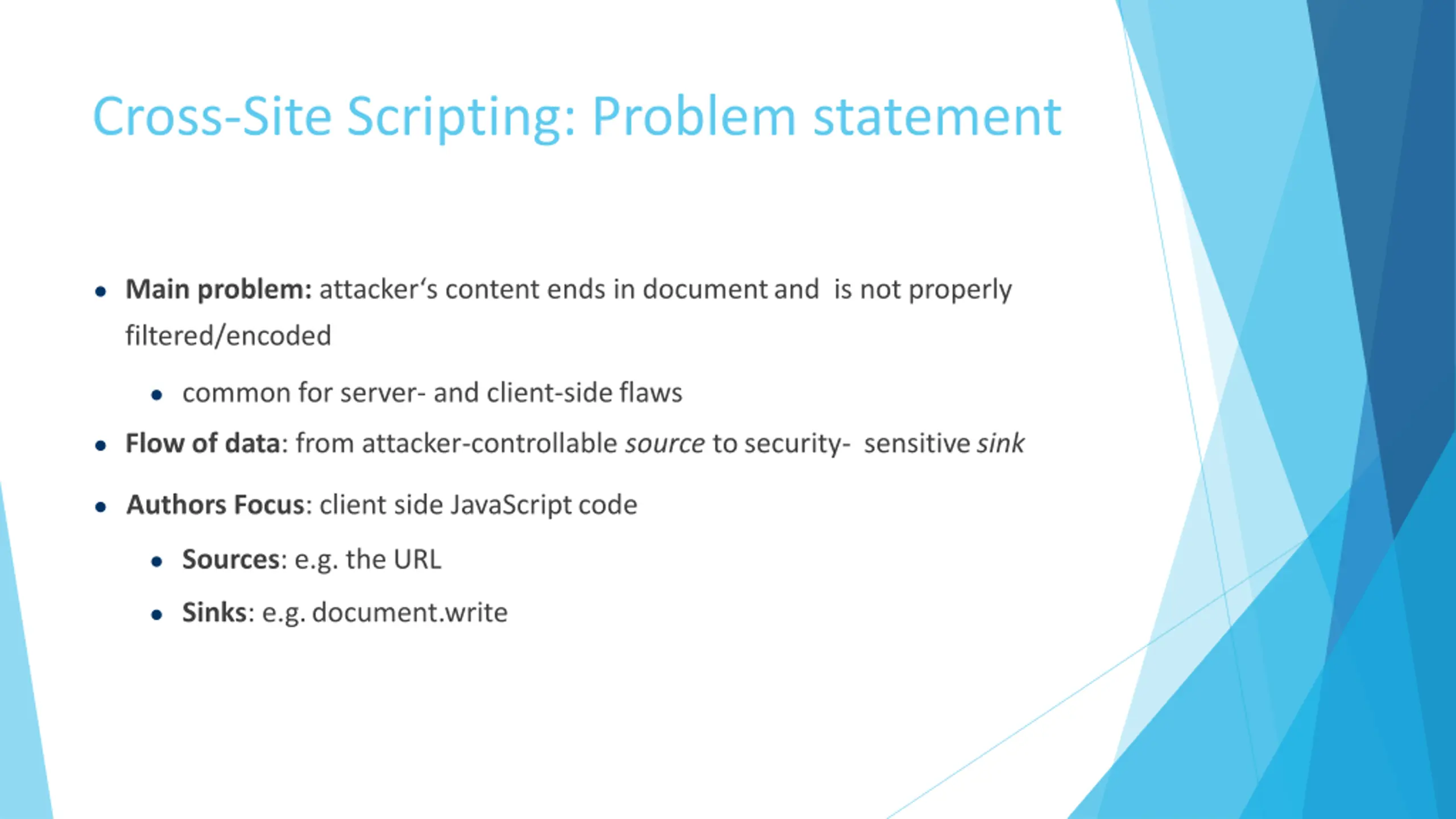 Cross-Site Scripting: Problem statement Main problem: attacker s content ends in document and is not properly filtered/encoded common for server- and client-side flaws Flow of data: from attacker-controllable source to security- sensitive sink Authors Focus: client side JavaScript code Sources: e.g. the URL Sinks: e.g. document.write