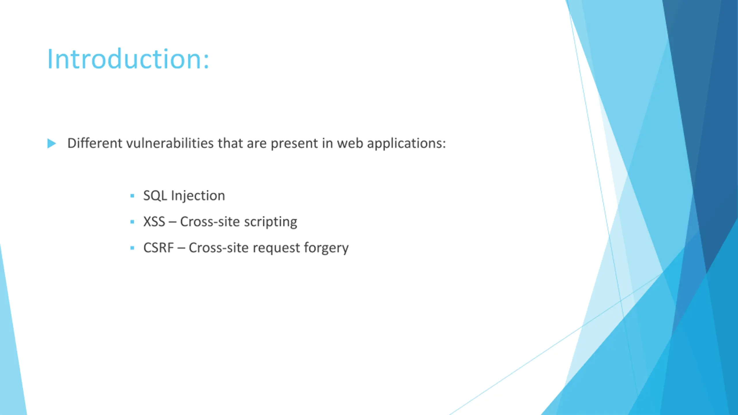 Introduction: Different vulnerabilities that are present in web applications: SQL Injection XSS Cross-site scripting CSRF Cross-site request forgery