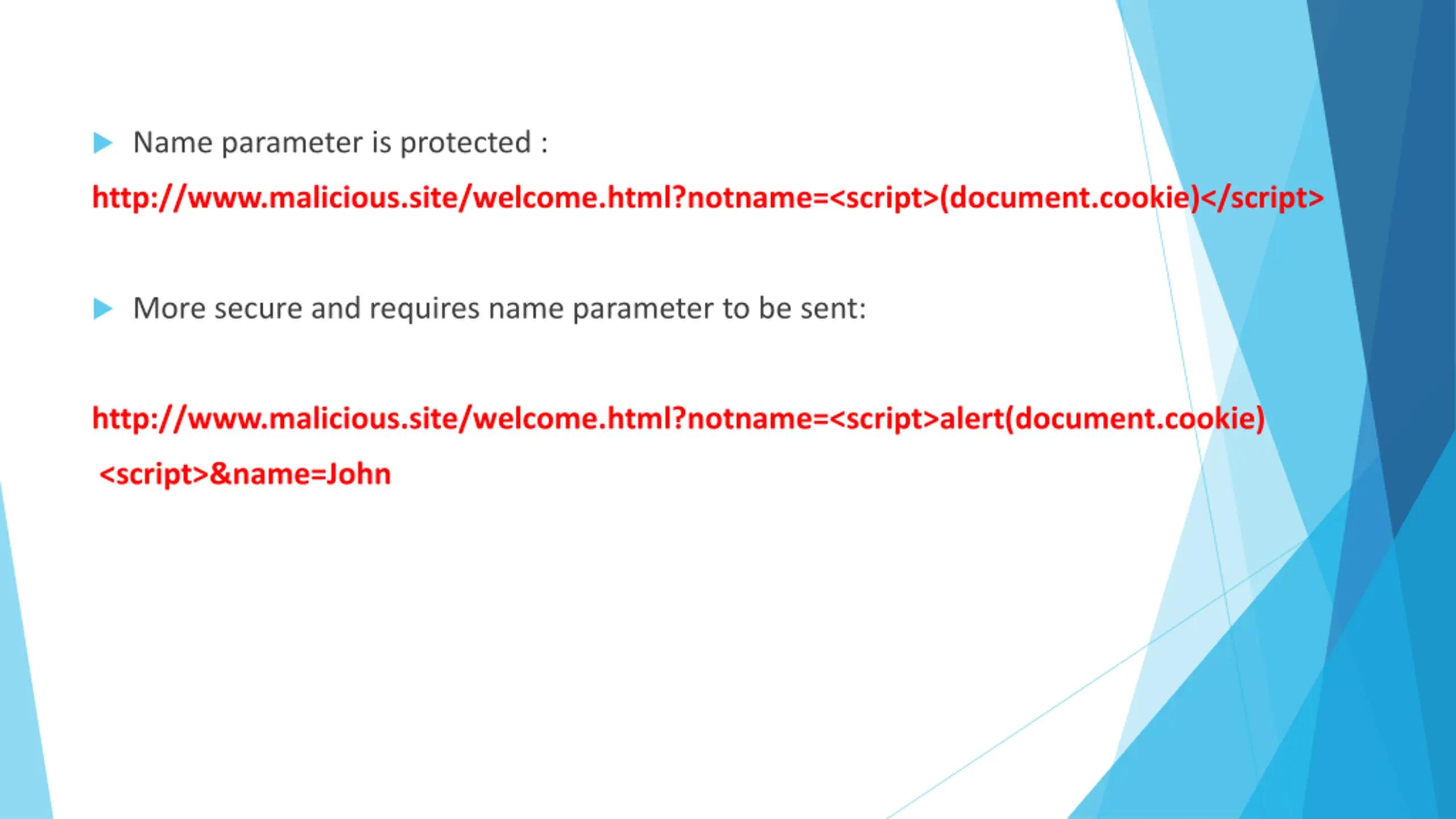 Name parameter is protected : http://www.malicious.site/welcome.html?notname=<script>(document.cookie)</script> More secure and requires name parameter to be sent: http://www.malicious.site/welcome.html?notname=<script>alert(document.cookie) <script>&name=John