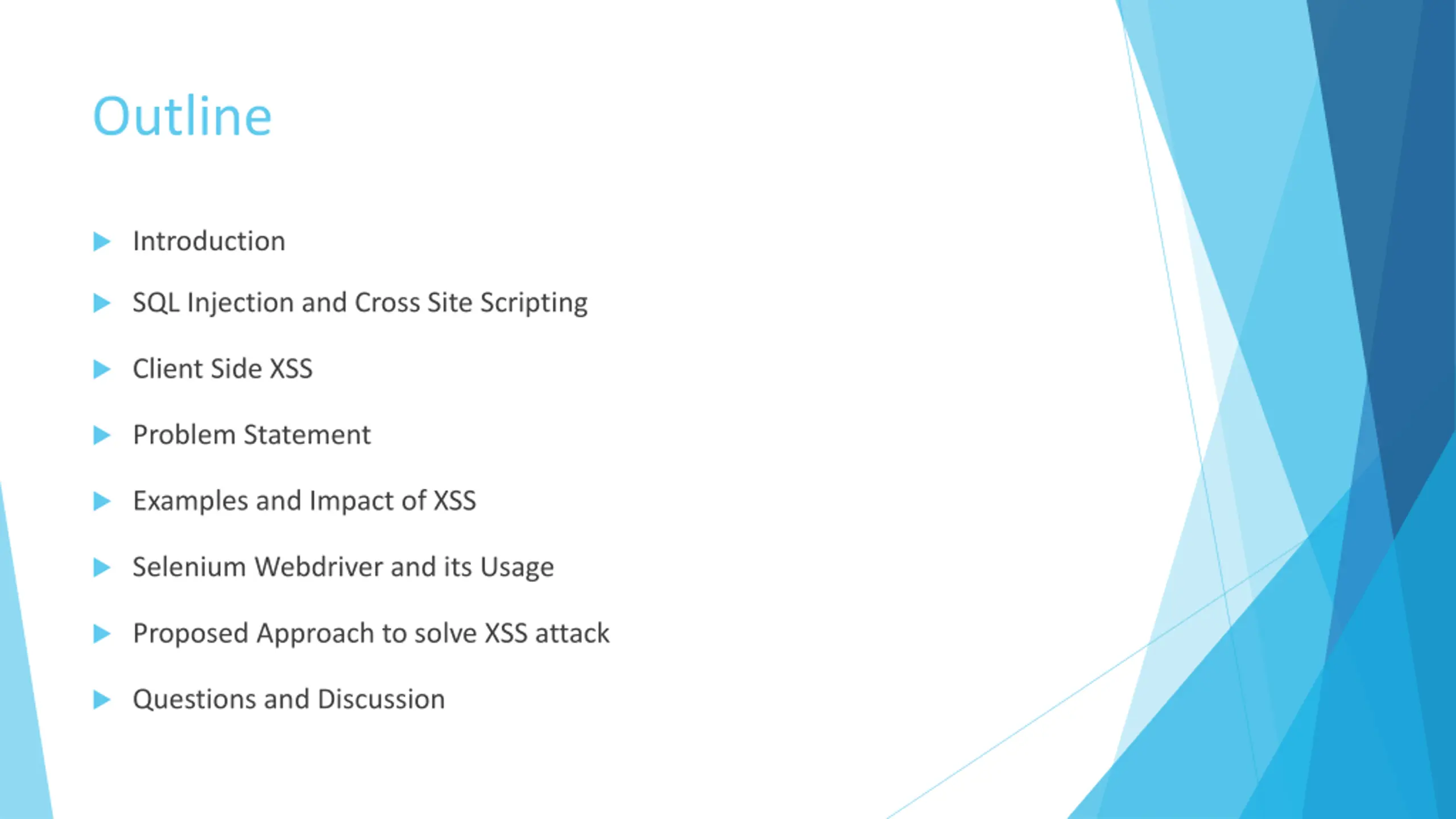 Outline Introduction SQL Injection and Cross Site Scripting Client Side XSS Problem Statement Examples and Impact of XSS Selenium Webdriver and its Usage Proposed Approach to solve XSS attack Questions and Discussion