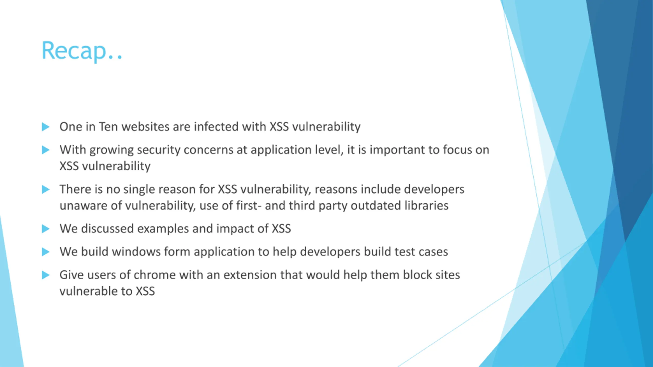 Recap.. One in Ten websites are infected with XSS vulnerability With growing security concerns at application level, it is important to focus on XSS vulnerability There is no single reason for XSS vulnerability, reasons include developers unaware of vulnerability, use of first- and third party outdated libraries We discussed examples and impact of XSS We build windows form application to help developers build test cases Give users of chrome with an extension that would help them block sites vulnerable to XSS