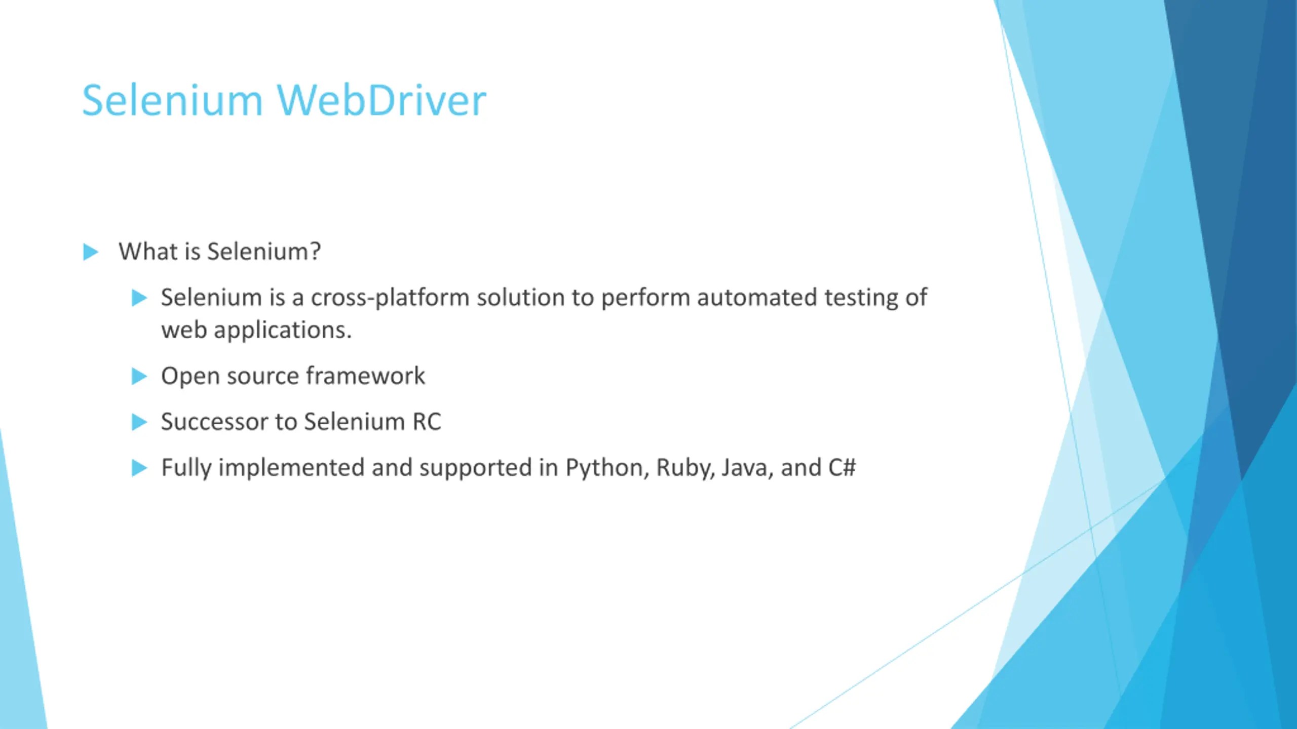 Selenium WebDriver What is Selenium? Selenium is a cross-platform solution to perform automated testing of web applications. Open source framework Successor to Selenium RC Fully implemented and supported in Python, Ruby, Java, and C#