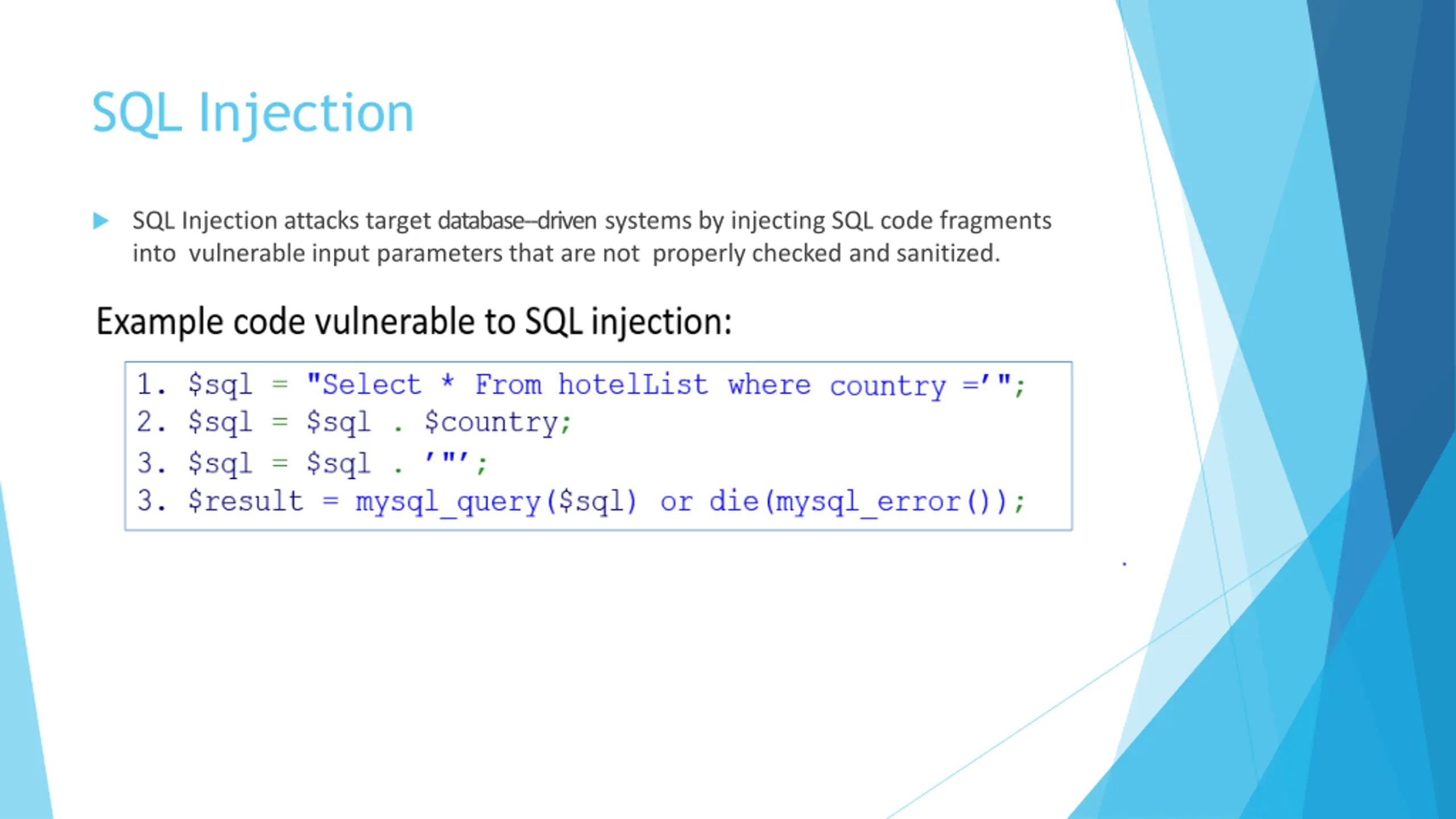 SQL Injection SQL Injection attacks target database- driven systems by injecting SQL code fragments into vulnerable input parameters that are not properly checked and sanitized.
