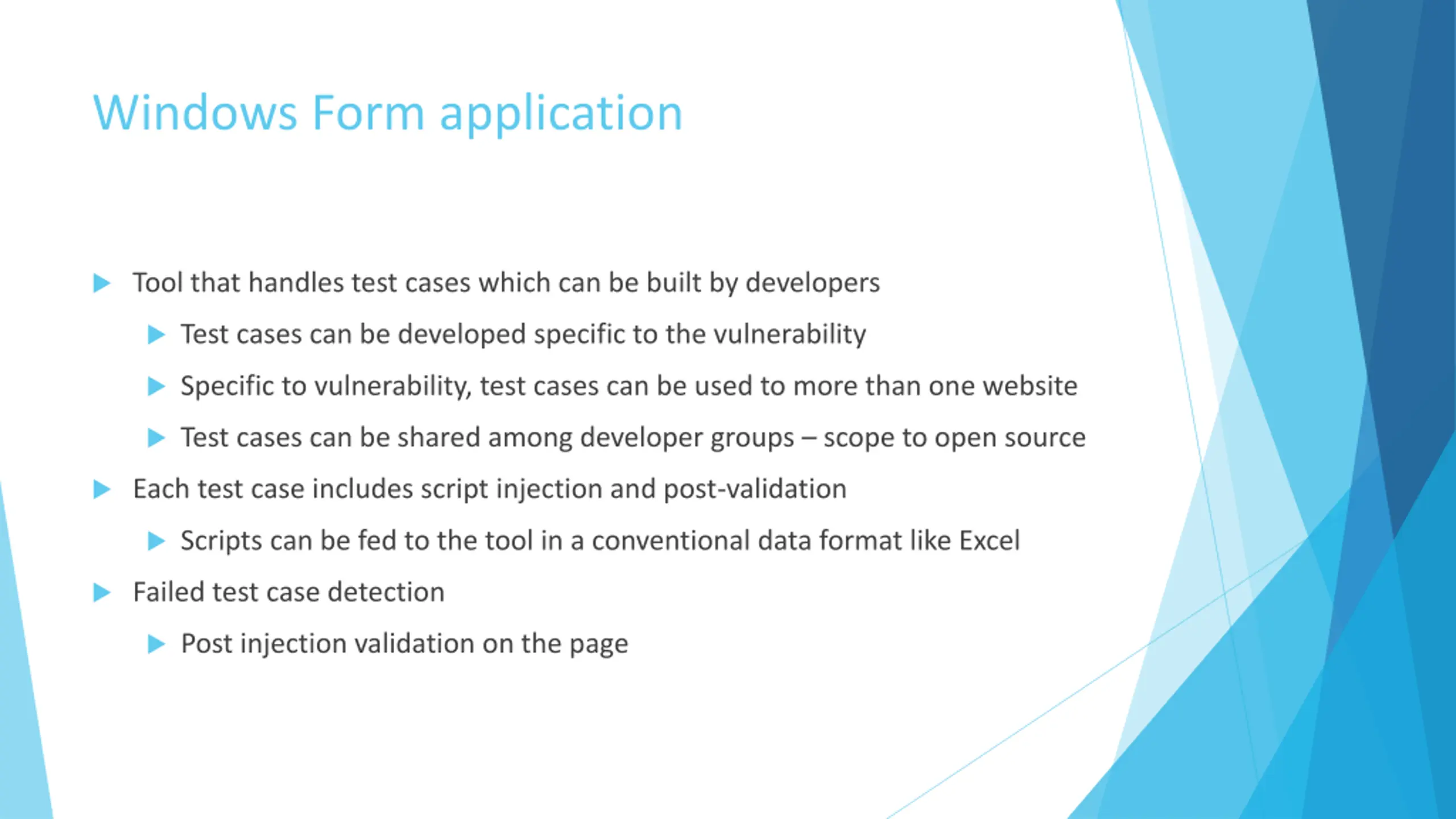Windows Form application Tool that handles test cases which can be built by developers Test cases can be developed specific to the vulnerability Specific to vulnerability, test cases can be used to more than one website Test cases can be shared among developer groups scope to open source Each test case includes script injection and post-validation Scripts can be fed to the tool in a conventional data format like Excel Failed test case detection Post injection validation on the page