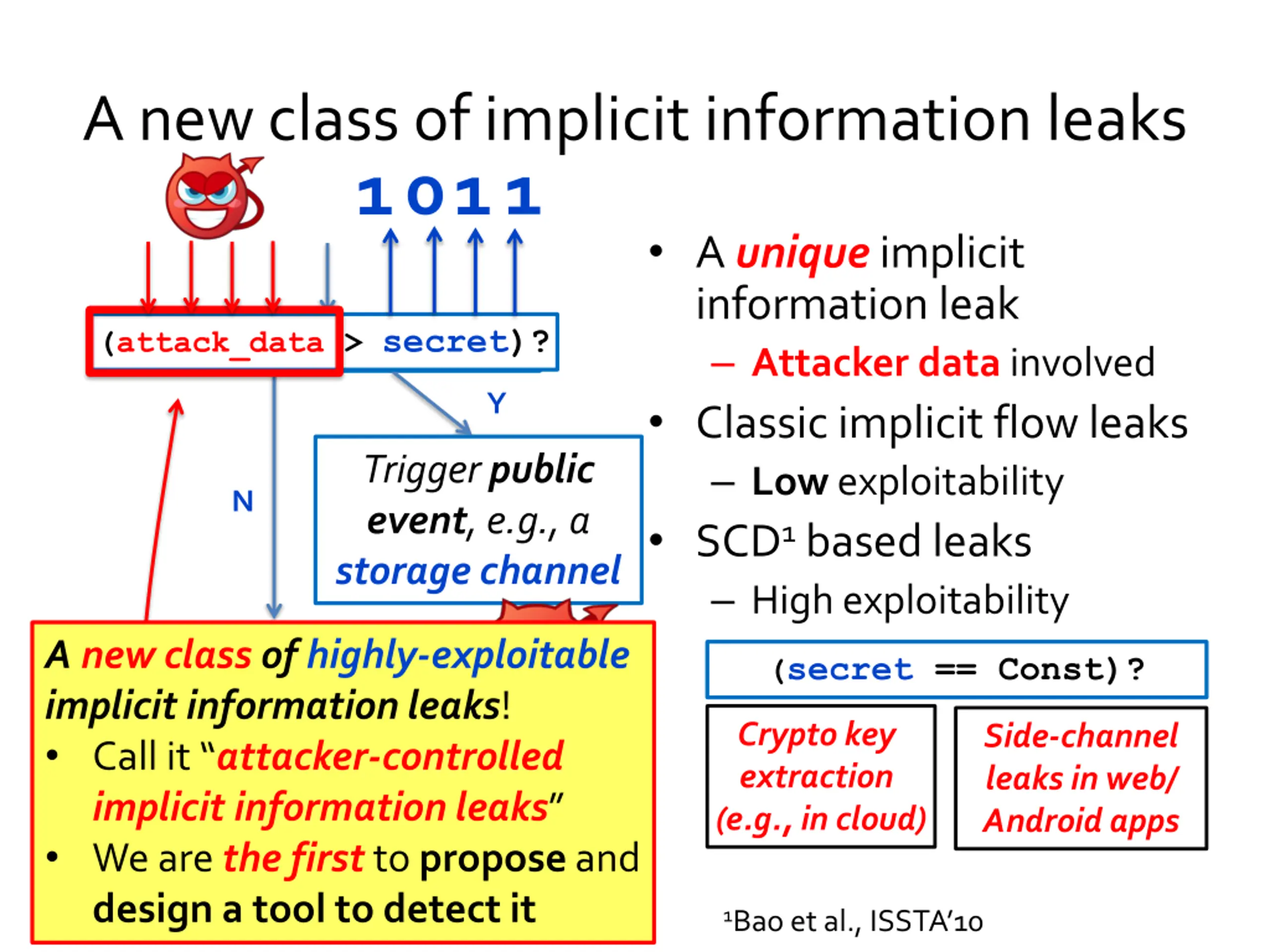 A new class of implicit information leaks 1011 A unique implicit information leak Attacker data involved Classic implicit flow leaks Low exploitability SCD1 based leaks High exploitability (pkt.seq > rcv_nxt)? (attack_data > secret)? Y Trigger public event, e.g., a storage channel N A new class of highly-exploitable implicit information leaks! Call it attacker-controlled implicit information leaks We are the firstto propose and design a tool to detect it (secret == Const)? Crypto key extraction (e.g., in cloud) Side-channel leaks in web/ Android apps Collaborative attacker 11 1Bao et al., ISSTA 10