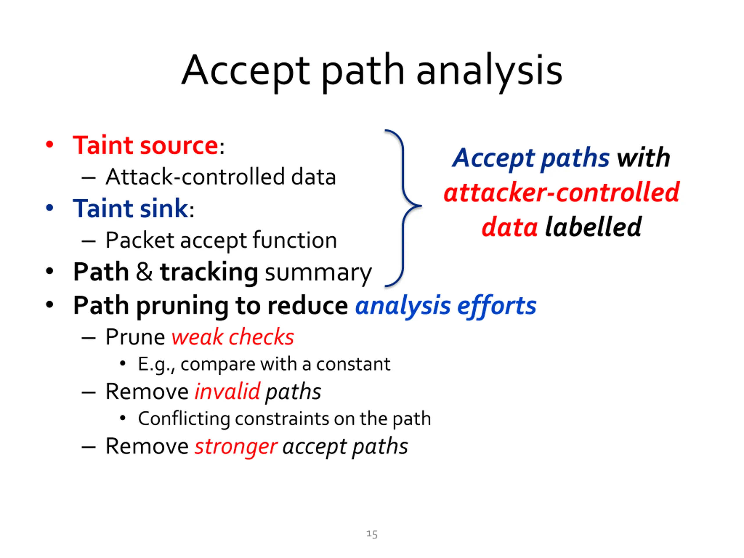 Accept path analysis Taint source: Attack-controlled data Taint sink: Packet accept function Path & tracking summary Path pruning to reduce analysis efforts Prune weak checks E.g., compare with a constant Remove invalid paths Conflicting constraints on the path Remove stronger accept paths Accept paths with attacker-controlled data labelled 15