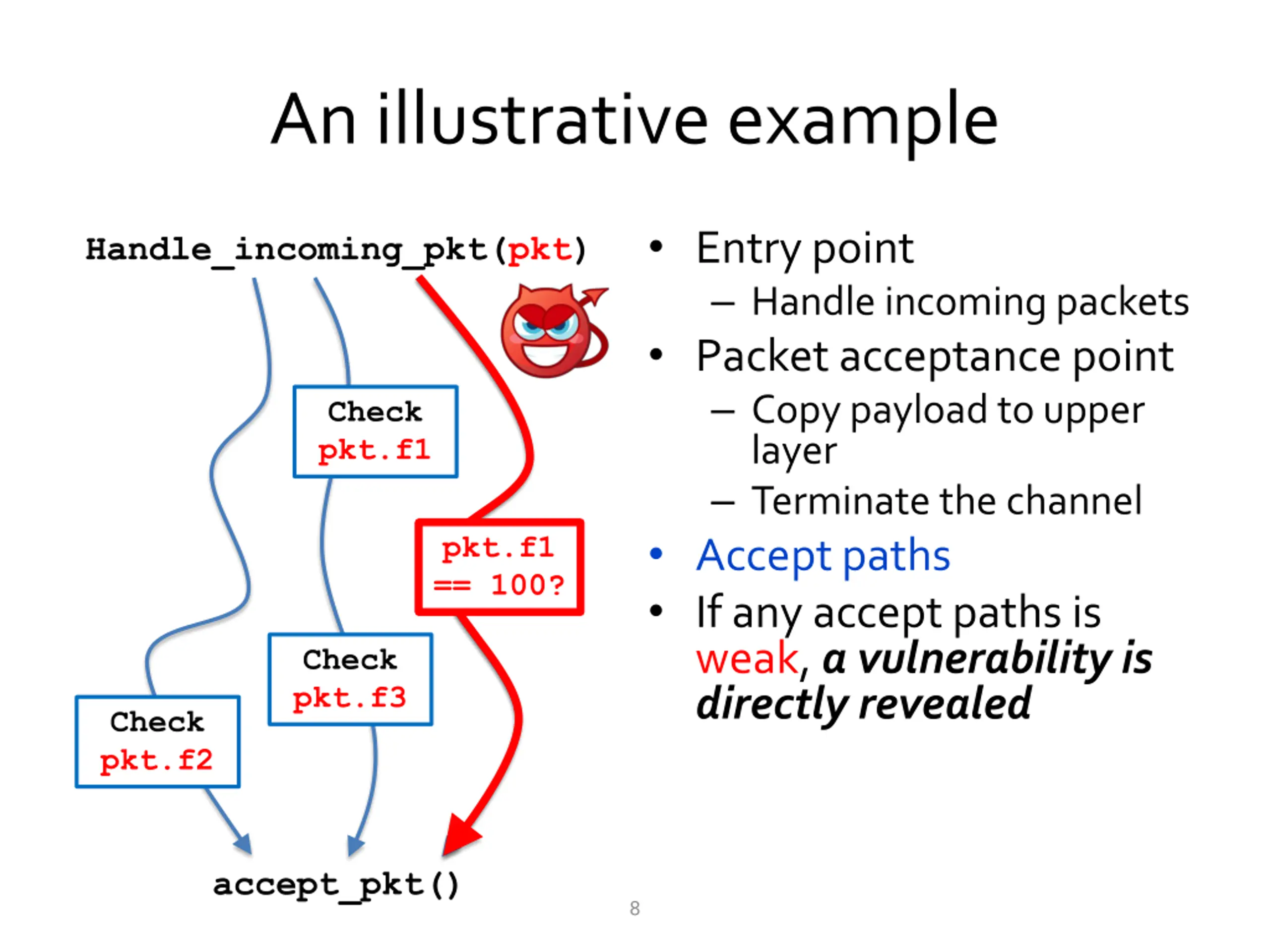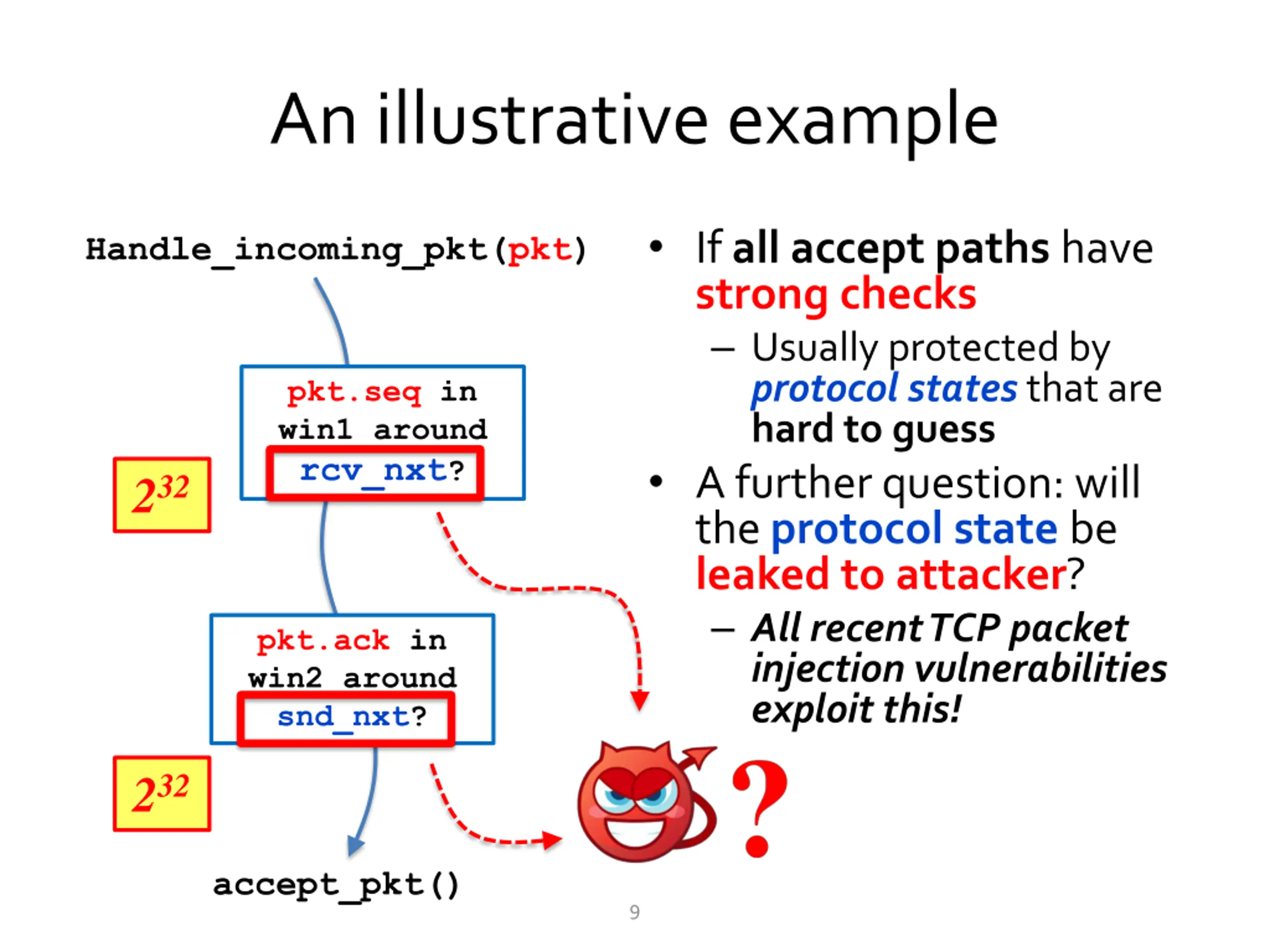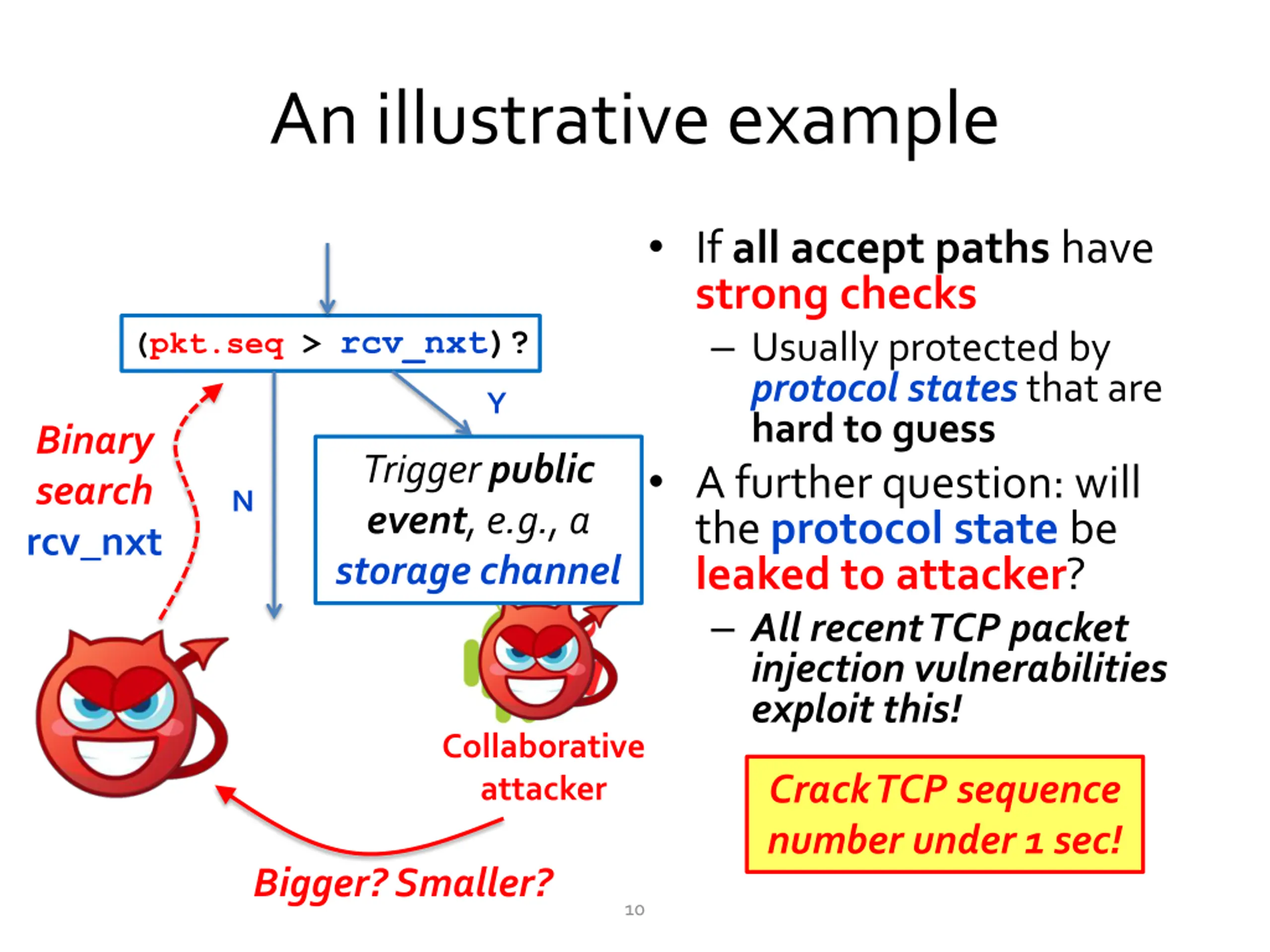 An illustrative example If all accept paths have strong checks Usually protected by protocol states that are hard to guess A further question: will the protocol state be leaked to attacker? All recent TCP packet injection vulnerabilities exploit this! Handle_incoming_pkt(pkt) pkt.seq in win1 around Check pkt.f1 rcv_nxt? 232 pkt.ack in win2 around Check pkt.f3 snd_nxt? 232 accept_pkt() 9