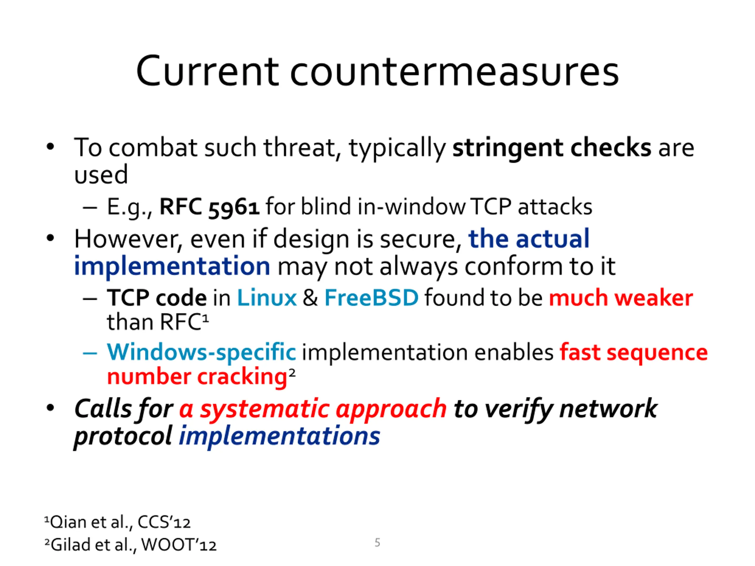 Current countermeasures To combat such threat, typically stringent checks are used E.g., RFC 5961 for blind in-window TCP attacks However, even if design is secure, the actual implementation may not always conform to it TCP code in Linux & FreeBSD found to be much weaker than RFC1 Windows-specific implementation enables fast sequence number cracking2 Calls for a systematic approach to verify network protocol implementations 1Qian et al., CCS 12 2Gilad et al., WOOT 12 5