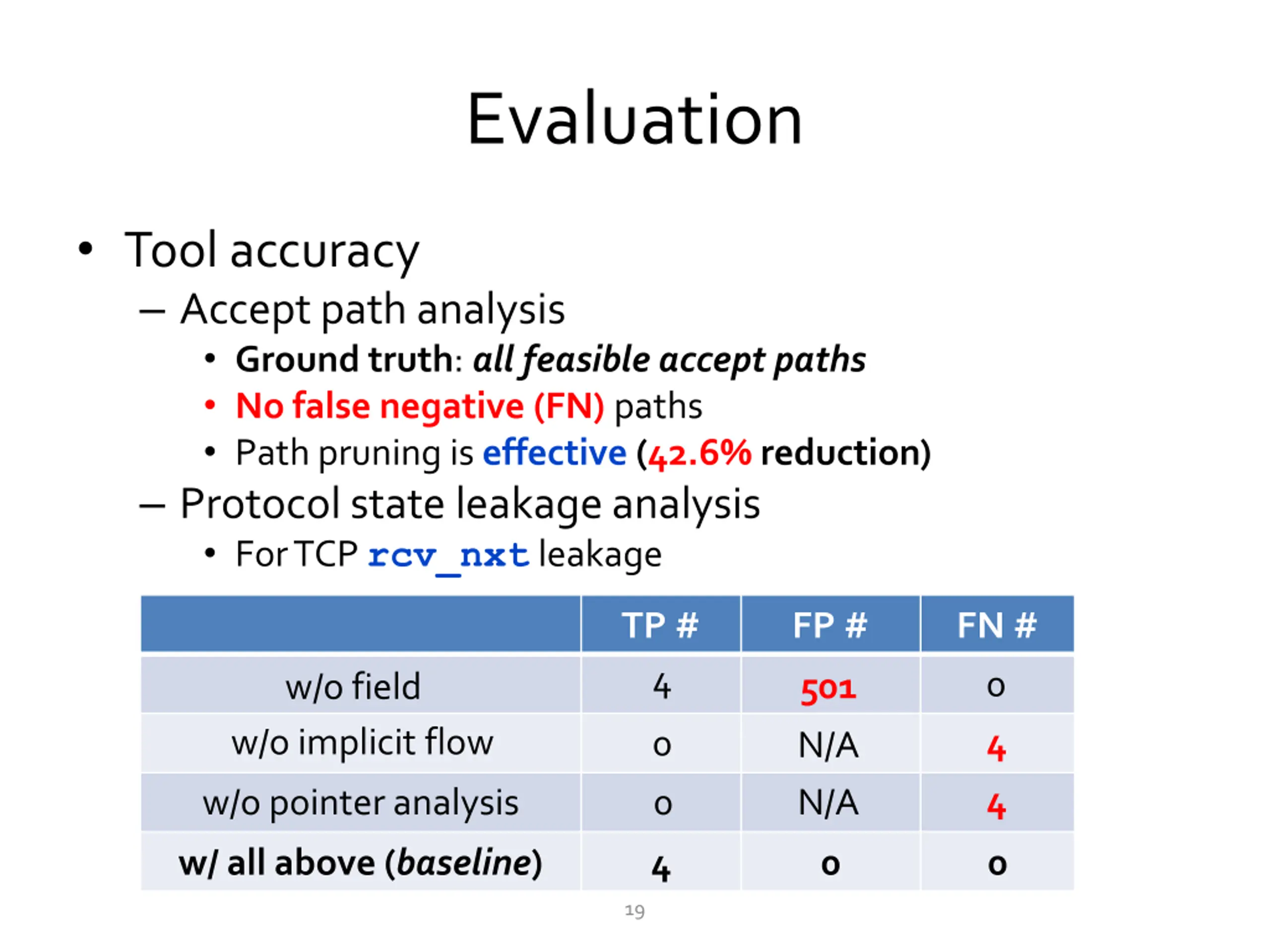 Evaluation Tool accuracy Accept path analysis Ground truth: all feasible accept paths No false negative (FN) paths Path pruning is effective (42.6% reduction) Protocol state leakage analysis For TCP rcv_nxt leakage TP # 4 FP # FN # 0 4 501 w/o field w/o implicit flow 0 N/A N/A 4 w/o pointer analysis 0 w/ all above (baseline) 4 0 0 19