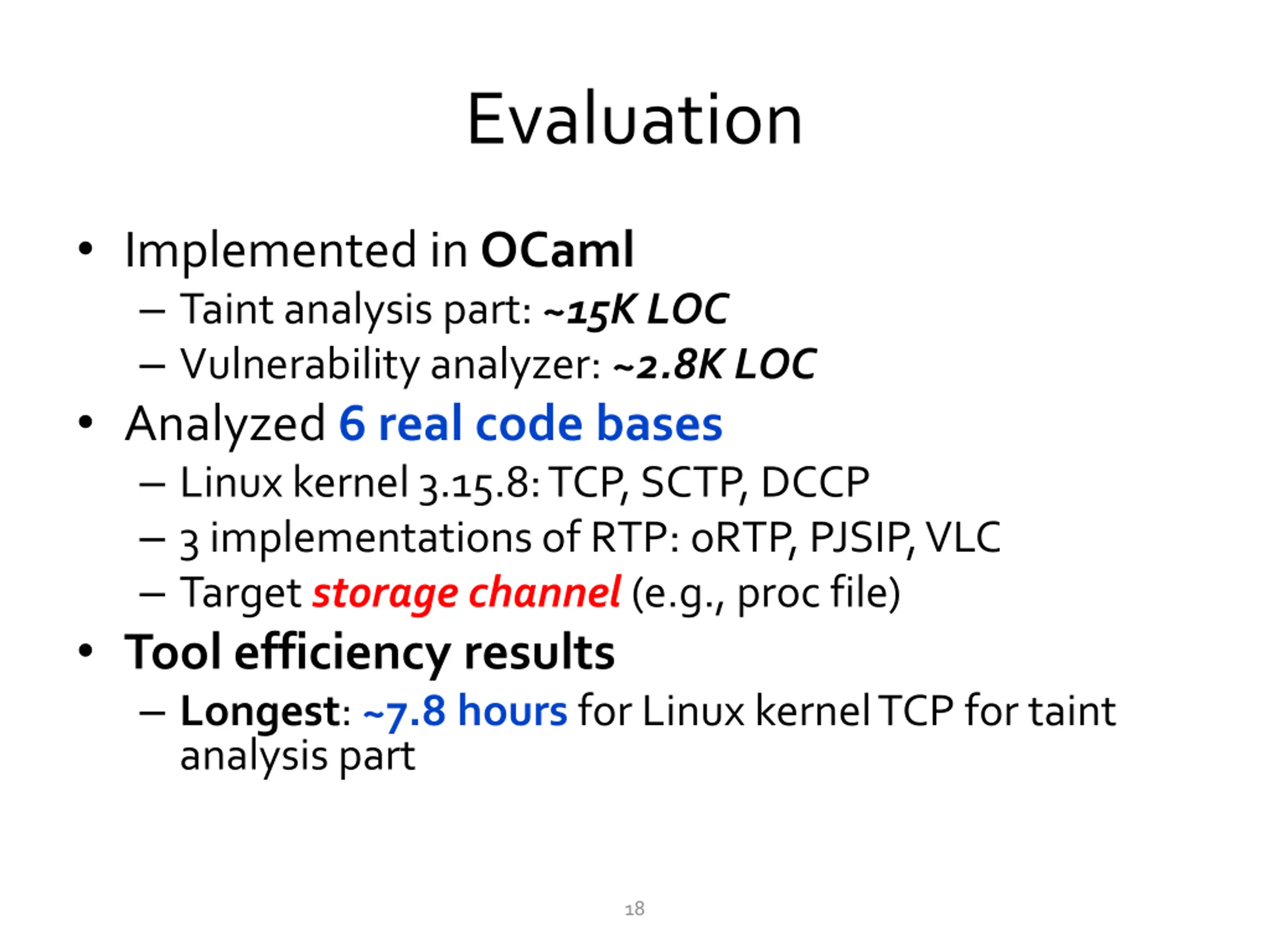 Evaluation Implemented in OCaml Taint analysis part: ~15K LOC Vulnerability analyzer: ~2.8K LOC Analyzed 6 real code bases Linux kernel 3.15.8: TCP, SCTP, DCCP 3 implementations of RTP: oRTP, PJSIP, VLC Target storage channel (e.g., proc file) Tool efficiency results Longest: ~7.8 hours for Linux kernel TCP for taint analysis part 18