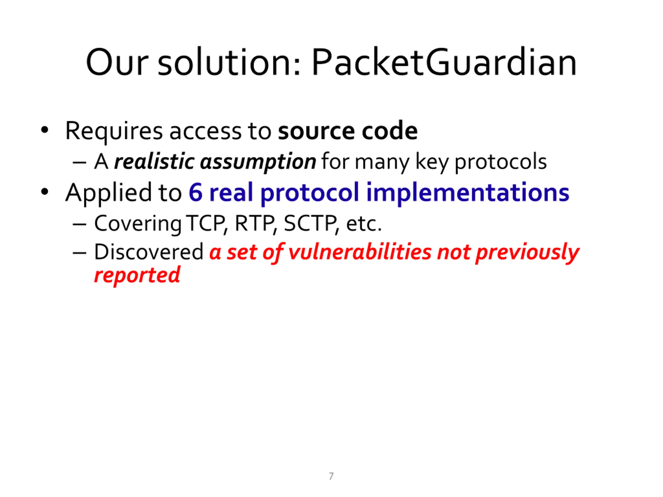 Our solution: PacketGuardian Requires access to source code A realistic assumption for many key protocols Applied to 6 real protocol implementations Covering TCP, RTP, SCTP, etc. Discovered a set of vulnerabilities not previously reported 7