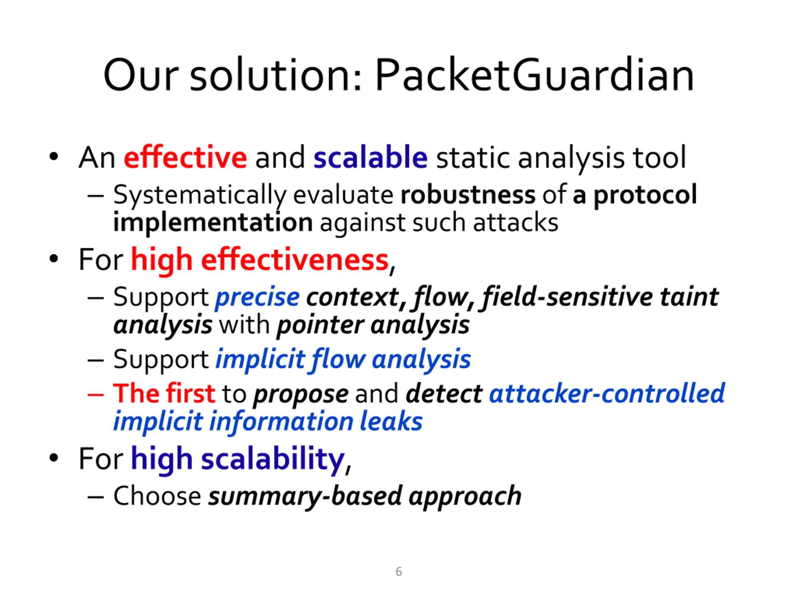 Our solution: PacketGuardian An effective and scalable static analysis tool Systematically evaluate robustness of a protocol implementation against such attacks For high effectiveness, Support precisecontext, flow, field-sensitive taint analysis with pointer analysis Support implicit flow analysis The first topropose and detectattacker-controlled implicit information leaks For high scalability, Choose summary-based approach 6