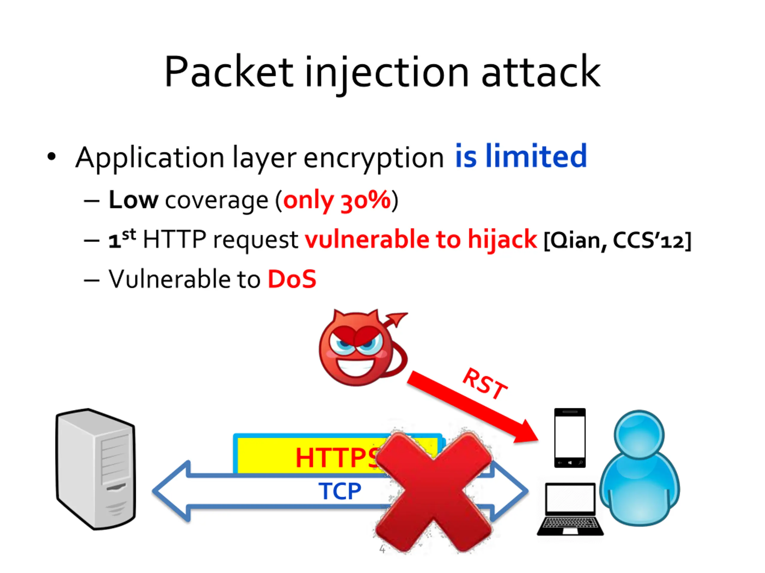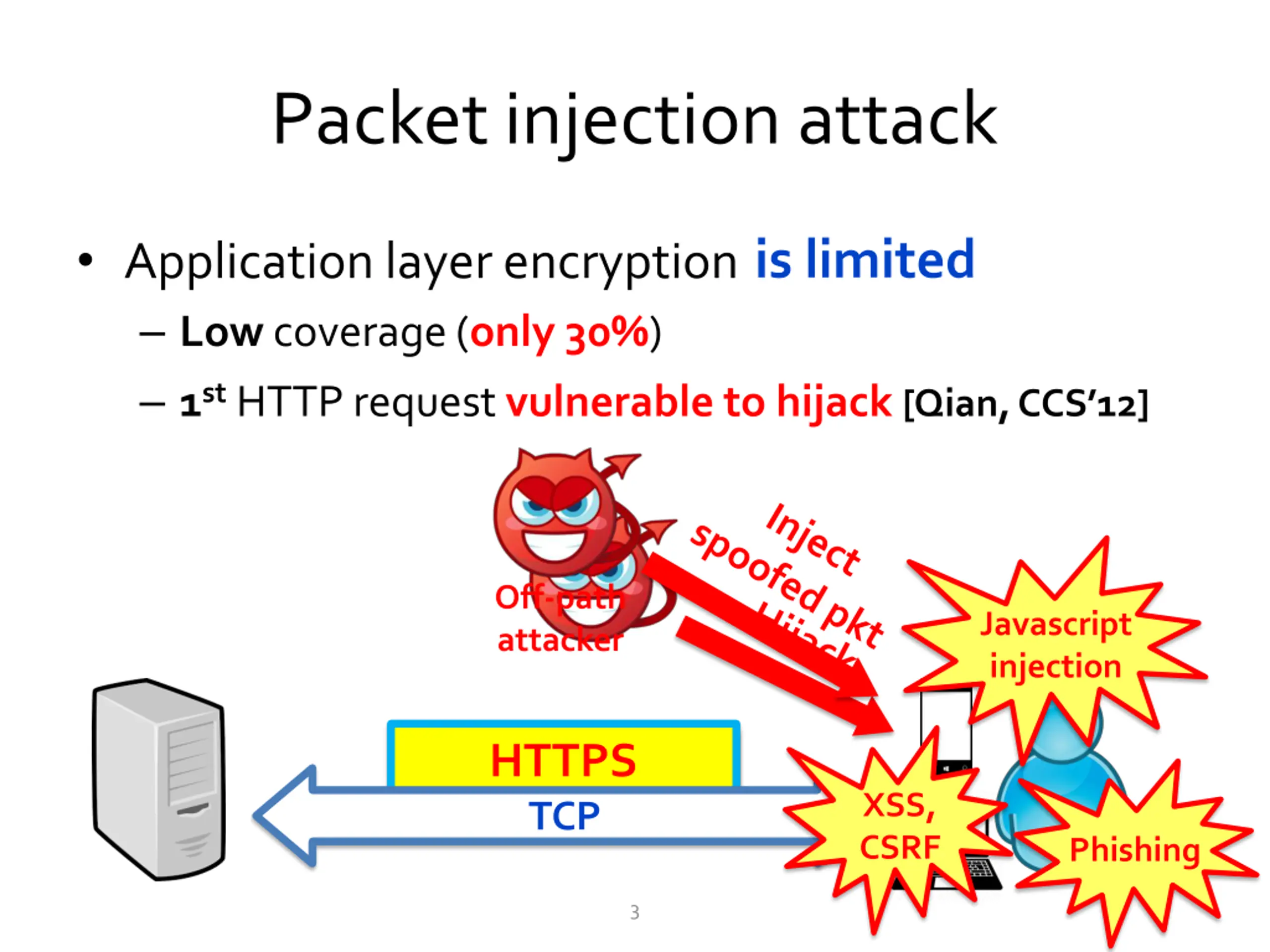 Packet injection attack Application layer encryption Low coverage (only 30%) 1st HTTP request vulnerable to hijack[Qian, CCS 12] Vulnerable to DoS is limited Off-path attacker Javascript injection HTTPS HTTP TCP XSS, CSRF Phishing 3