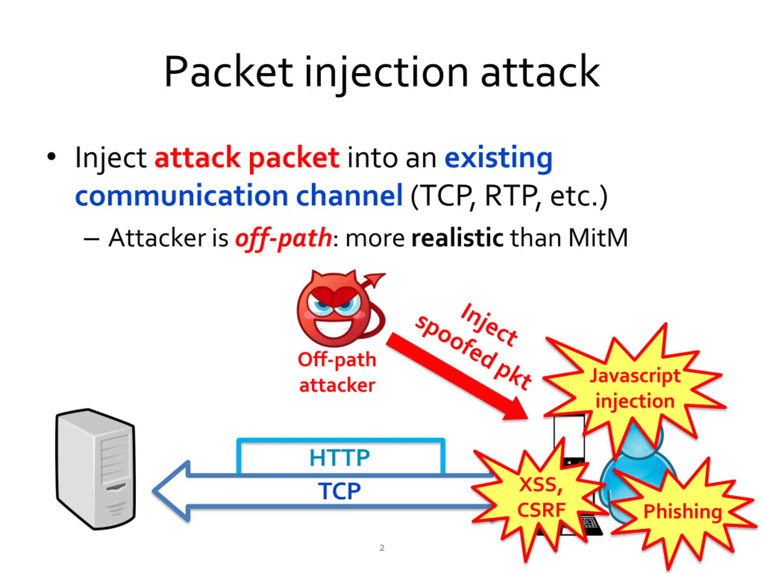 Packet injection attack Inject attack packet into an existing communication channel(TCP, RTP, etc.) Attacker is off-path: more realistic than MitM Off-path attacker Javascript injection HTTP XSS, CSRF TCP Phishing 2